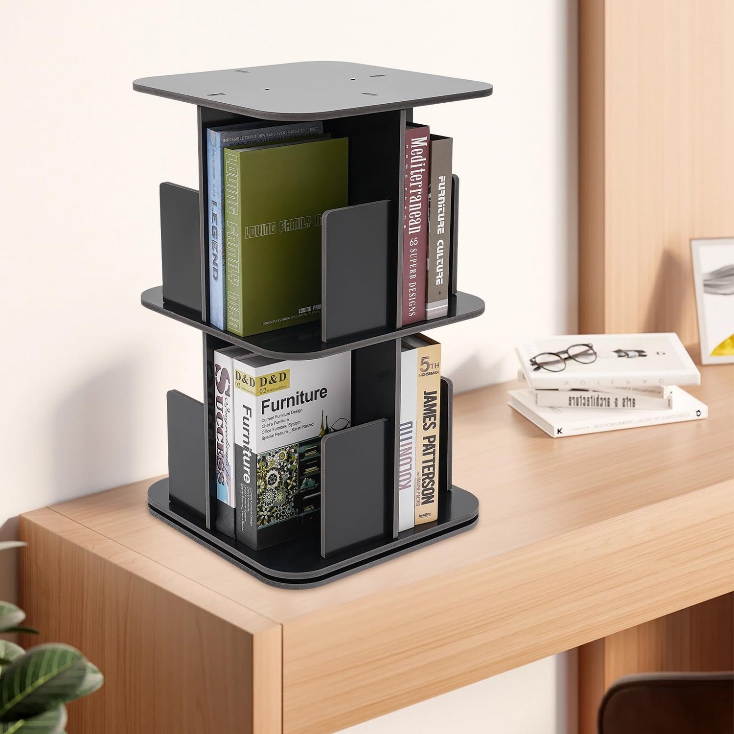 - 【Spinning Bookshelf】This swivel bookcase has two tiers of storage space, each tier has four independent compartments, you can categorize and store them according to the habit of reading and the type of books. Moreover, the platform on the top can also store some items to maximize the use of space.