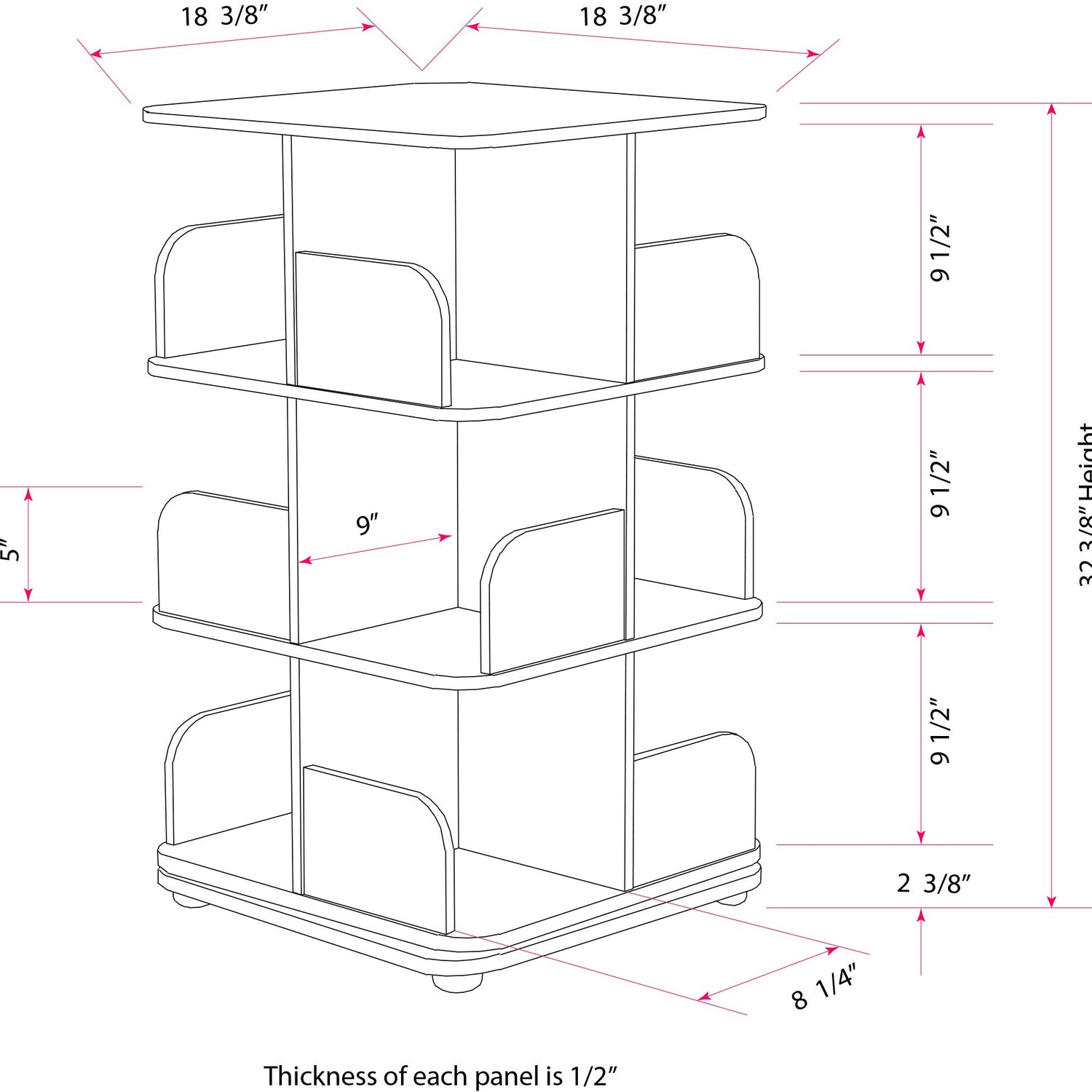 Dimensions for this impressive piece are 18 inches in width, 18 inches in depth, and 32 inches in height. Elevate your storage solutions with the Kings Brand Furniture 3-Tier Revolving Bookcase, where practicality meets timeless design.