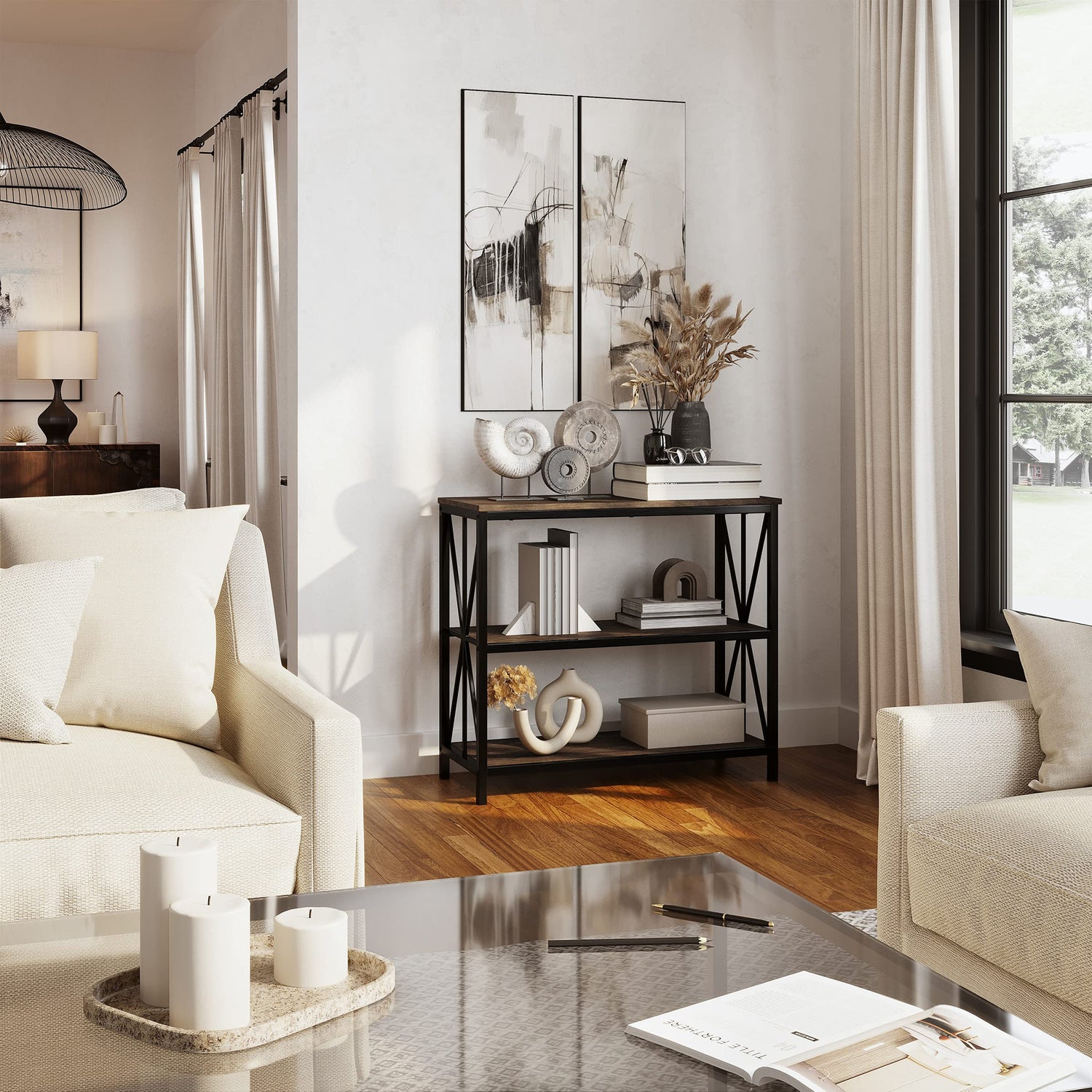 Details: The clean lines of the 3-Tier Industrial Bookshelf by Lavish Home provide a stylish yet functional piece for your home or office. This 3 shelf bookcase creates the perfect platform for displaying books, knickknacks, photo frames, or other home decor. This freestanding bookcase is constructed with high-grade MDF wood and a sturdy steel frame, so each shelf can hold up to 22lbs of your favorite items. Use this modern bookshelf to turn empty wall space into a focal point that is both attractive and purposeful.