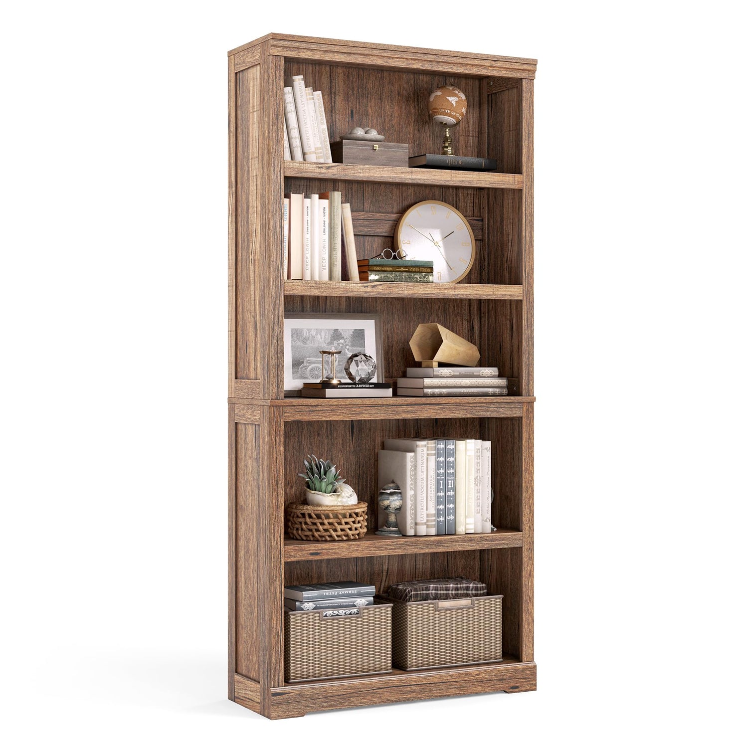 With its chic rustic style, this 5-tier bookcase measures 31"W x 11"D x 68"H. The clean lines and dark brown finish make it an ideal addition to virtually any space in your home, elevating your decor with a touch of sophistication.
