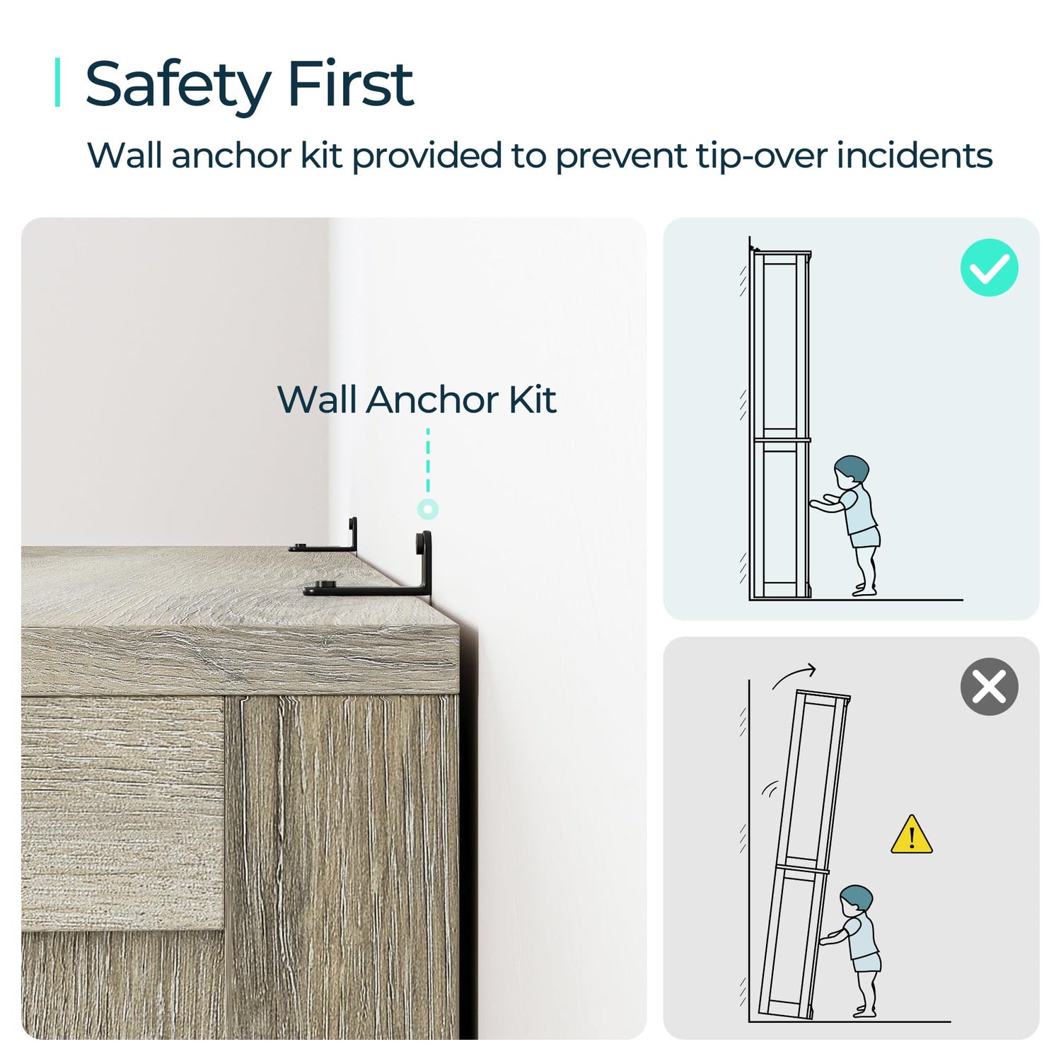 - SAFETY FIRST - Wall anchor kit provided to prevent tip-over incidents. The back of the bookcases are also equipped with a stabilizing device, which makes the book shelf more stable and durable.