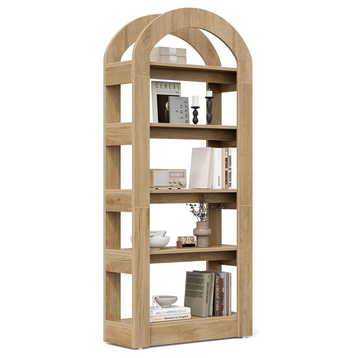 LITTLE TREE 5-Tier Bookshelf, Arch-Shaped Racks, Tall Standing Wooden Bookcase Display Shelf Modern Storage Solution (1, Teak Color)