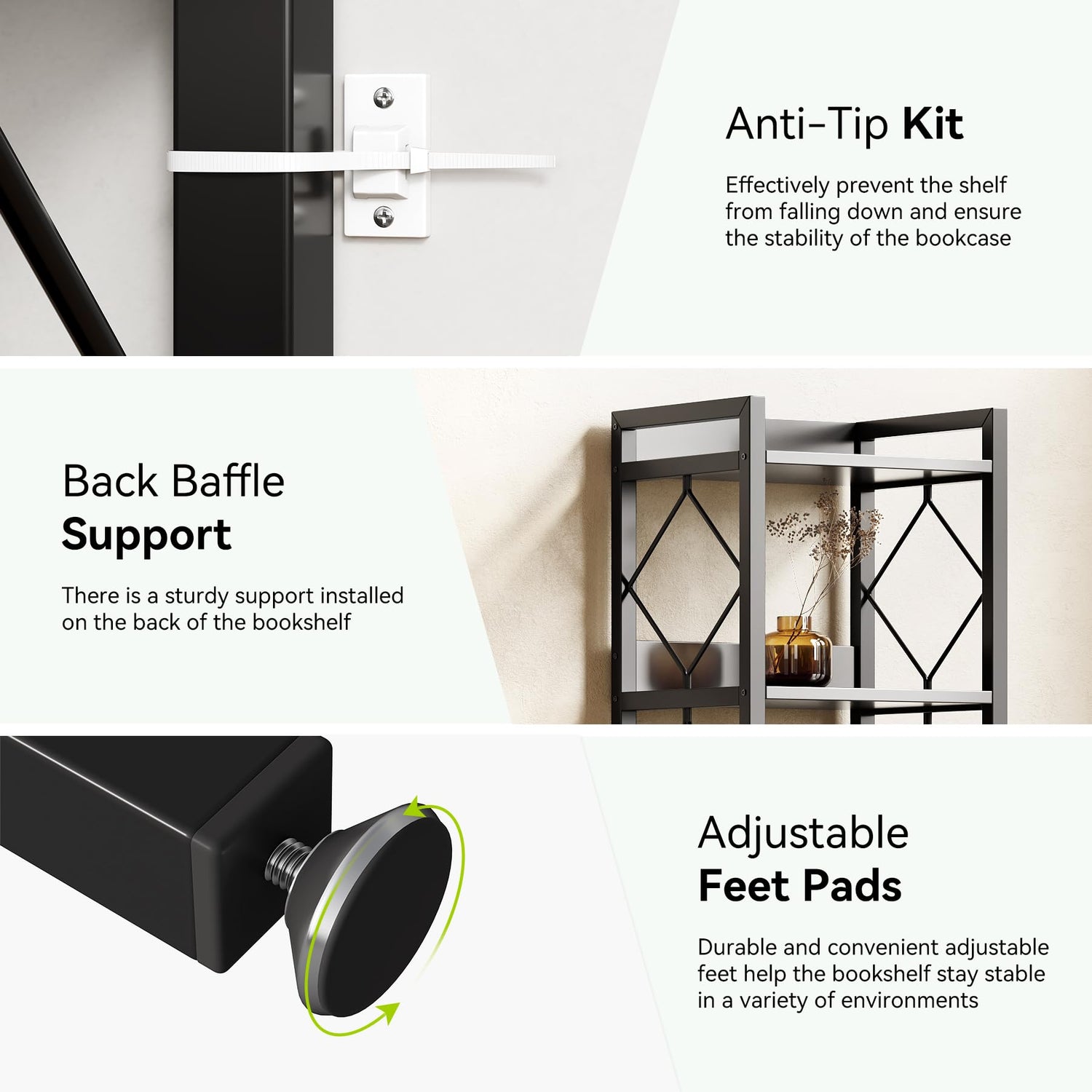 - Stability: This bookshelf features raised panels at the back and a modern diamond pattern on both sides to prevent items from falling and add aesthetic appeal. For added safety, a wall anti-tip kit is provided to prevent the bookshelf from tipping over