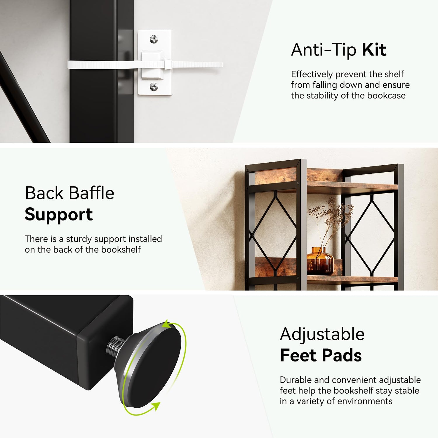 - Stability: This bookshelf features raised panels at the back and a modern diamond pattern on both sides to prevent items from falling and add aesthetic appeal. For added safety, a wall anti-tip kit is provided to prevent the bookshelf from tipping over