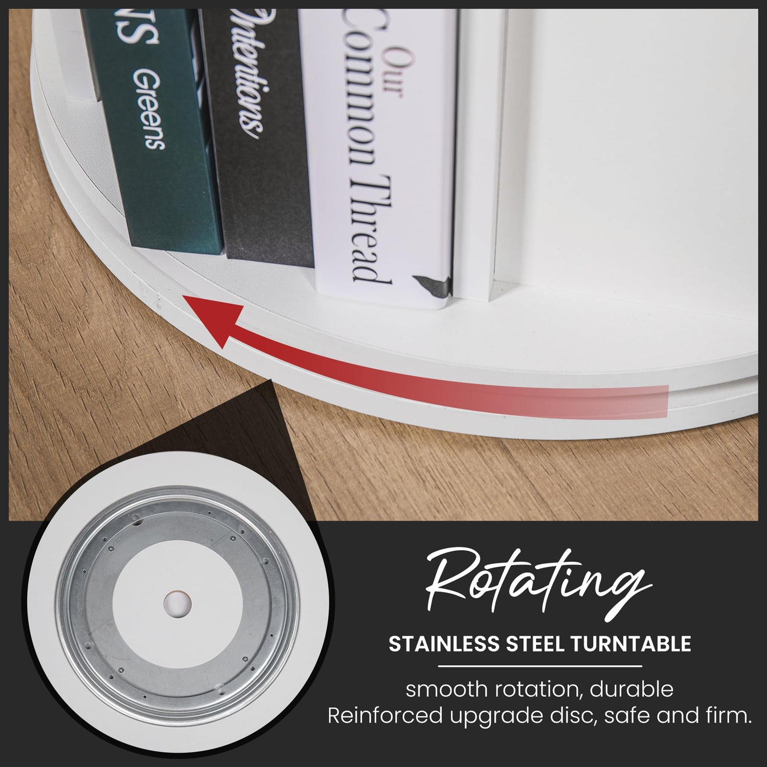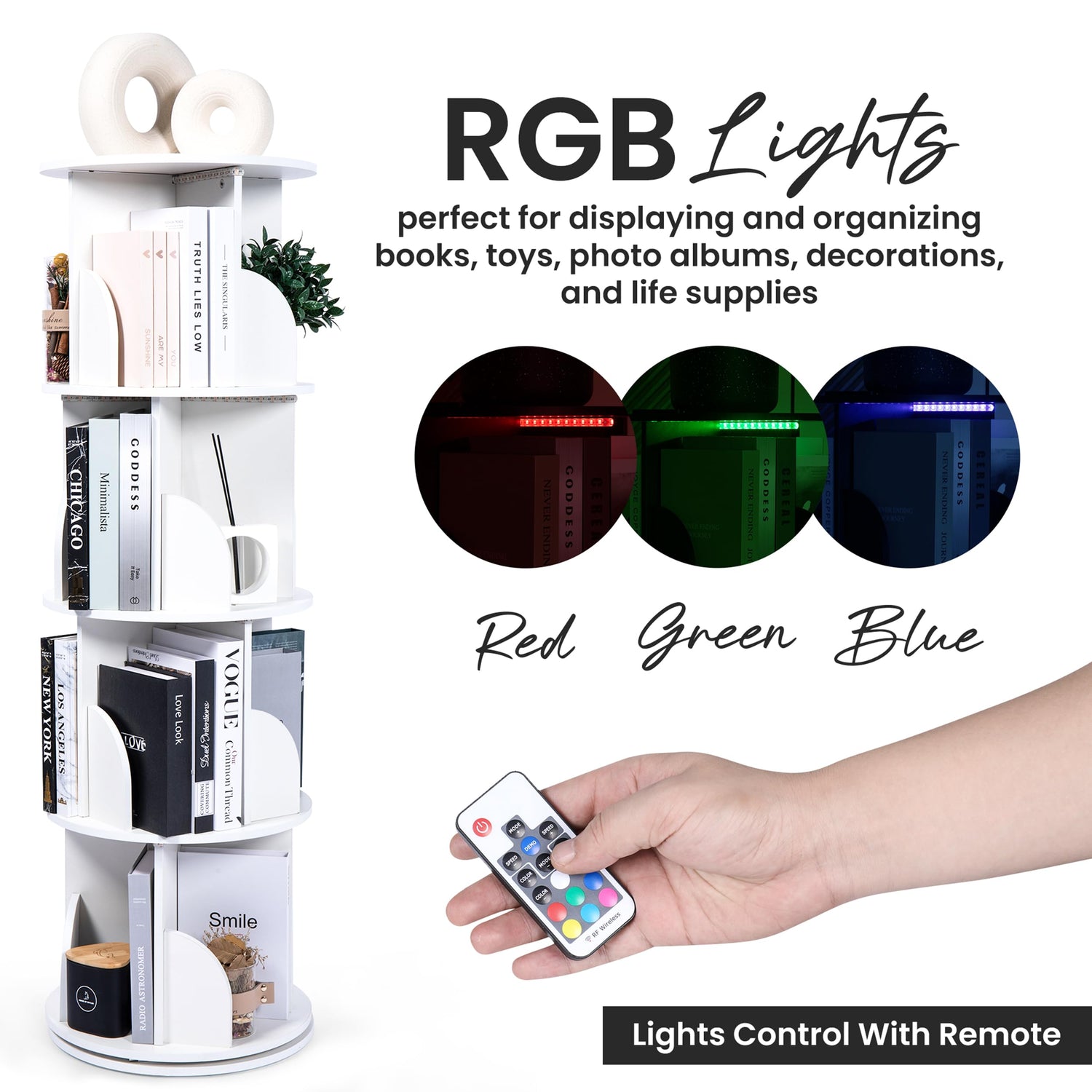 - ⚫Illuminate with Style: Transform your space with our bookshelf organizer, featuring integrated RGB LED lights. Customize your lighting with the included remote control. ⚫Effortless 360° Access: Our innovative design allows for smooth, 360° rotation, ensuring you can easily access your books and items from any angle. Ideal for maximizing space in any room, particularly in corner bookshelves arrangements. ⚫Spacious and Sleek: With a capacity to hold 60-100 books, this 4-tier small space bookshelf combines ample storage with a modern, sleek design. ⚫Built for Durability and Safety