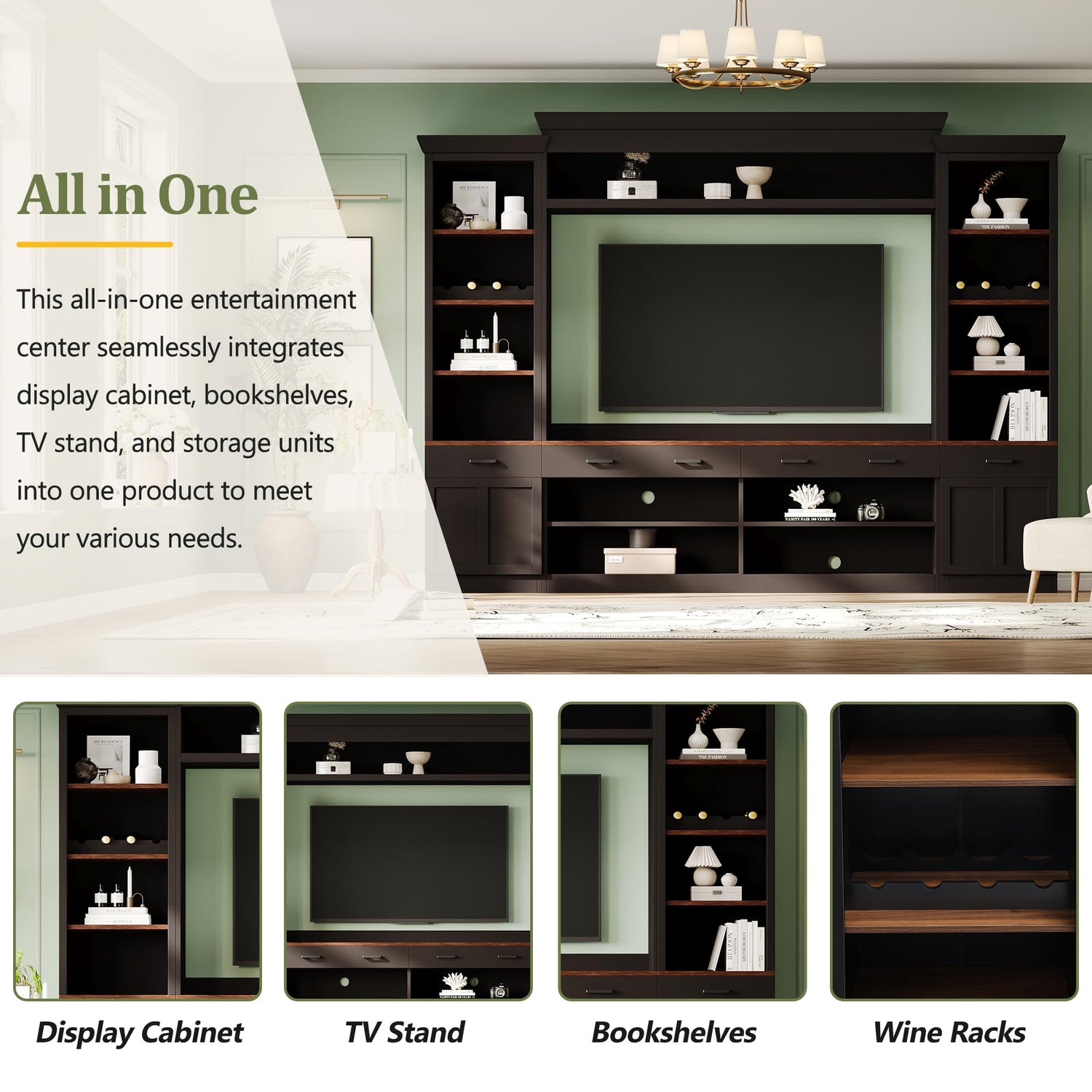 • [ An All-Inclusive Solution] This versatile entertainment center integrates a display cabinet, bookshelves, TV stand, and storage units, fulfilling various needs. Lateral cabinets come with wine racks, accommodating your wines or beverages. With this multifaceted product, functional and aesthetic demands are met in harmony.