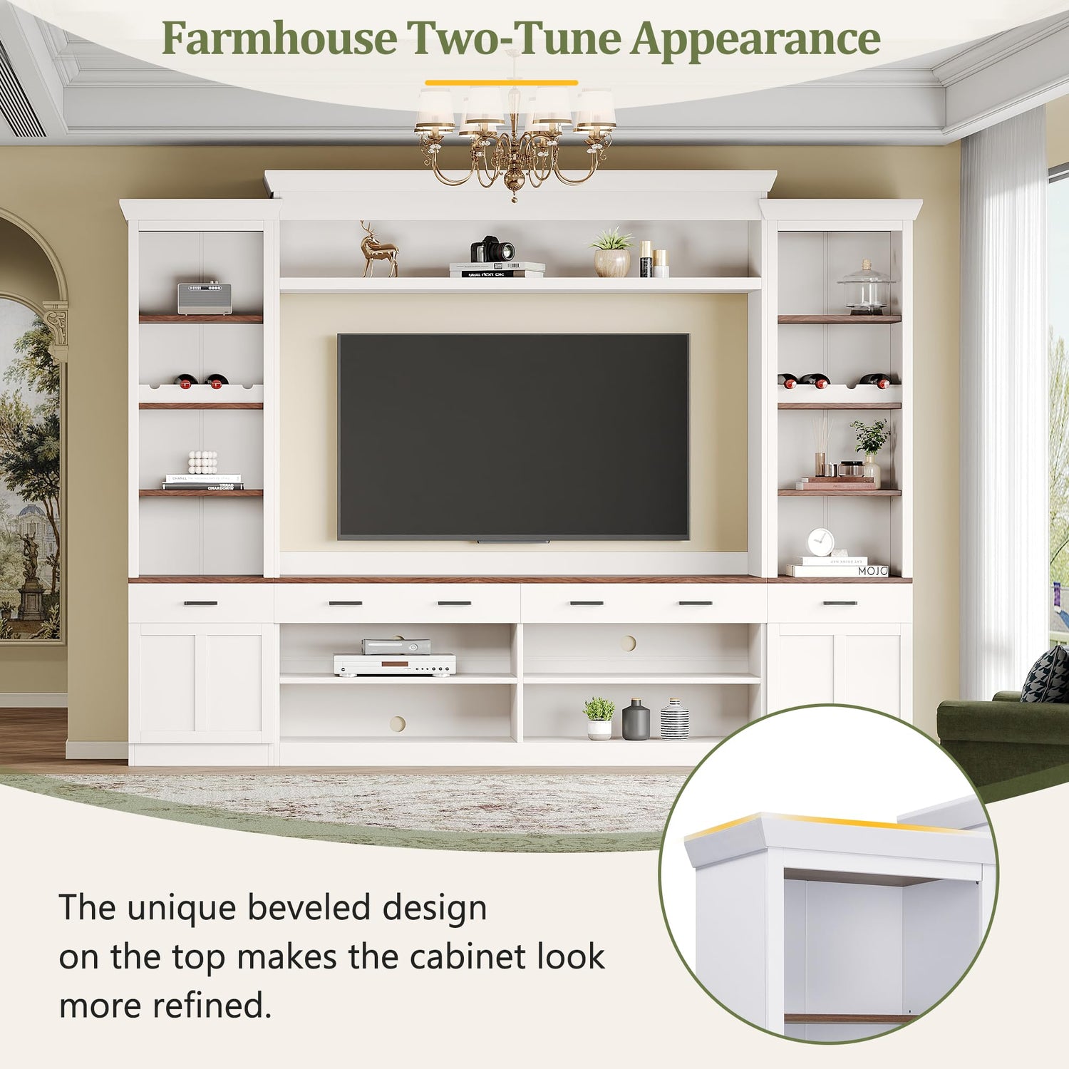 - [A Stylish TV Stand Set] This entertainment wall unit, adorned with black retro handles and a walnut-colored tabletop, exudes a unique charm. Its top features a refined beveled design, perfect for accommodating a TV up to 70 inches, adding a mid-century flair to your living room.