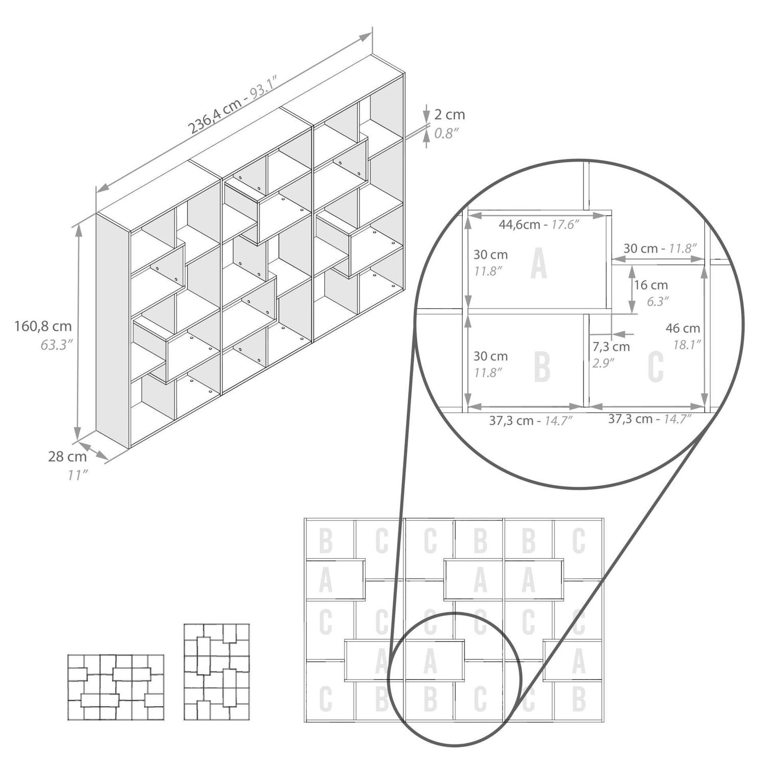 Constructed with sturdy materials, this double-sided bookcase also serves as a practical partition wall, creating distinct areas within your space. The multiple shelves offer ample room to hold and showcase your favourite items, from books to decorative pieces, with each compartment capable of supporting up to 44.1 lbs.