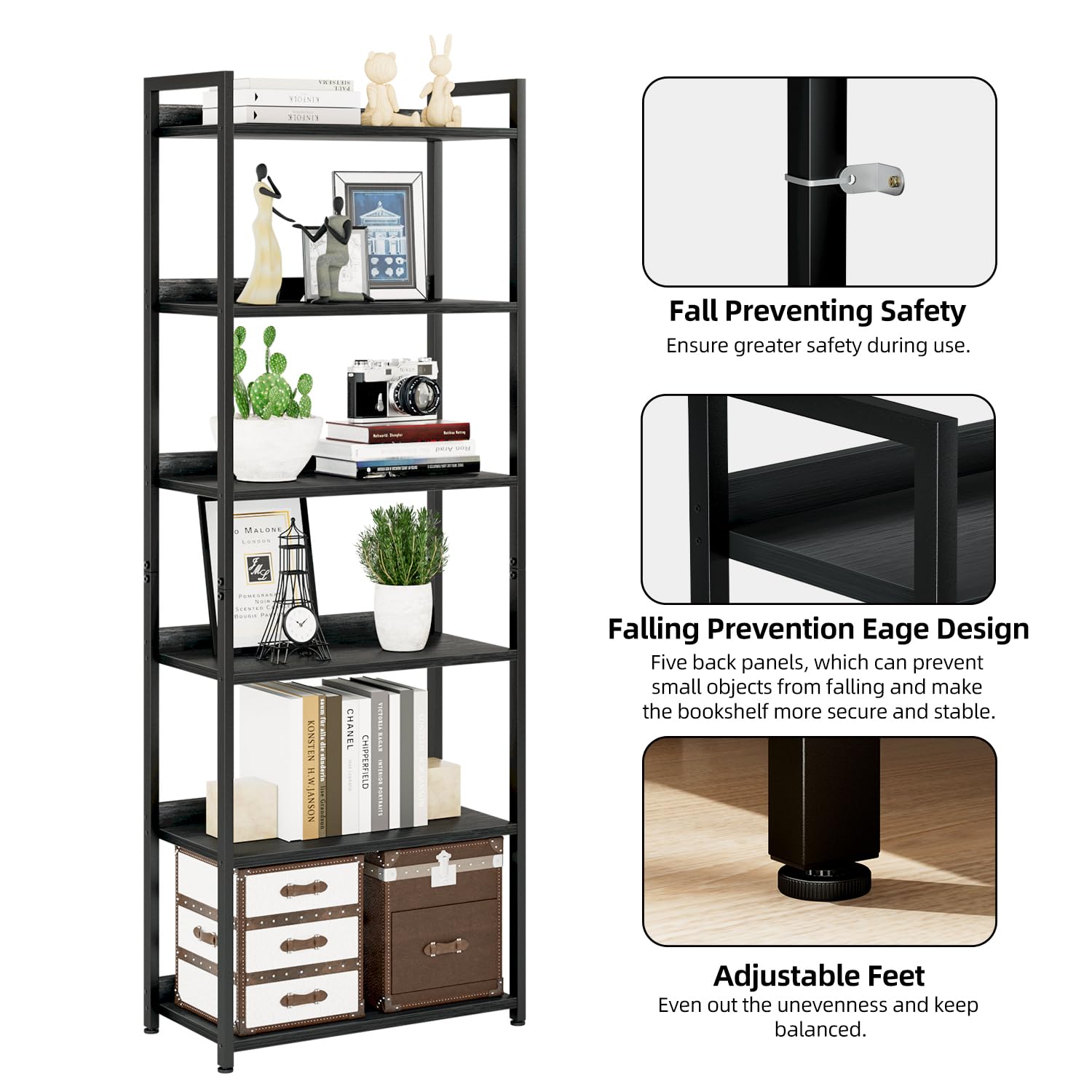 NUMENN Bookshelf, 6 Tier Bookshelves, Home Office Bookcase Shelf Storage Organizer, Free Standing Storage Shelving Unit for Bedroom, Living Room and Home Office, Black