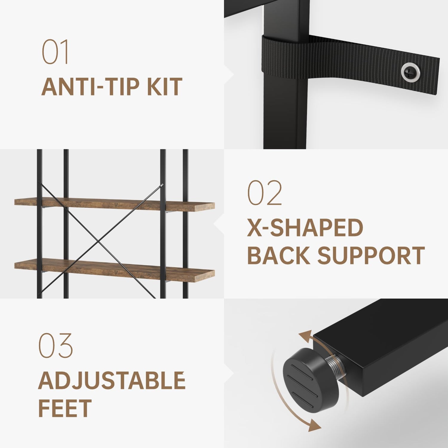 Designed for stability and durability, this bookshelf can bear heavy items with confidence. The matte black steel frame features X-shaped support, adjustable feet, and two anti-tip devices, ensuring it remains stable and secure in any environment.