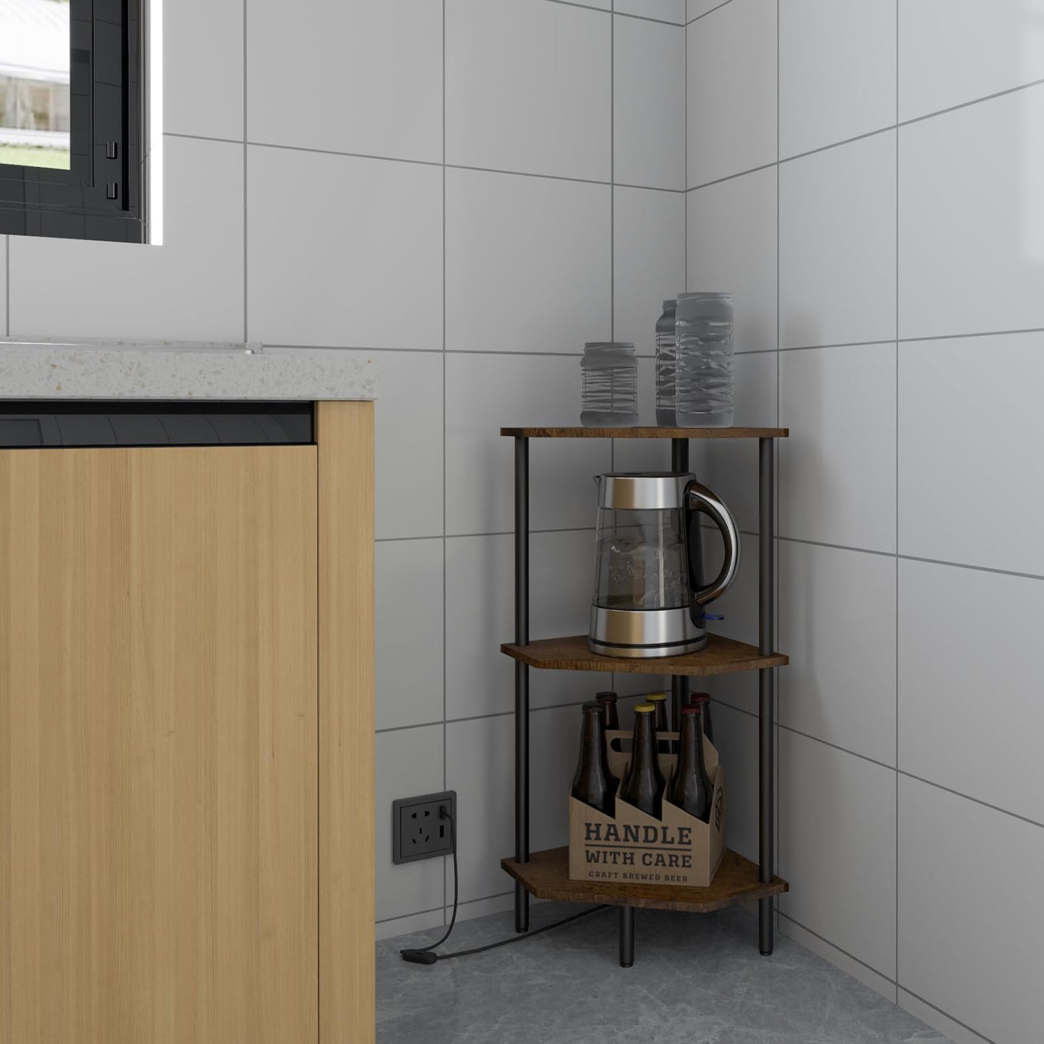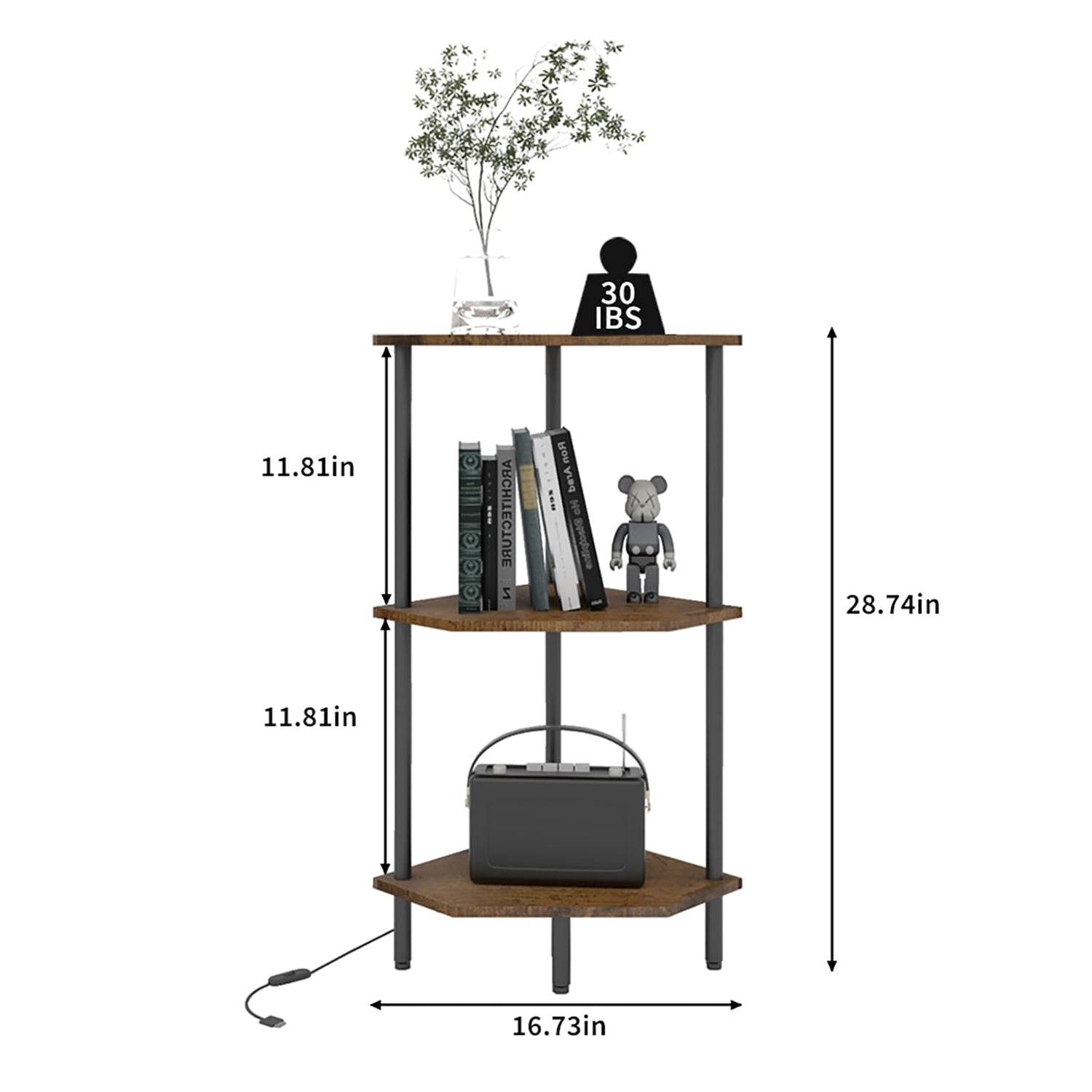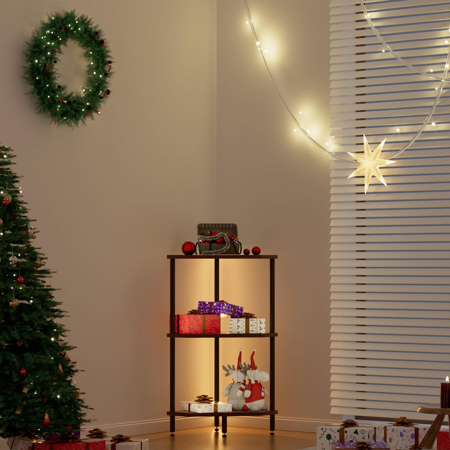 QLSPTFTS 3 Tier Corner Shelf with LED Light,Bookcase for Small Spaces,Display Shelf,Narrow Bookshelf,Plant Stand,Rustic Brown and Black,Suitable for Bedroom,Living Room,Kitchen