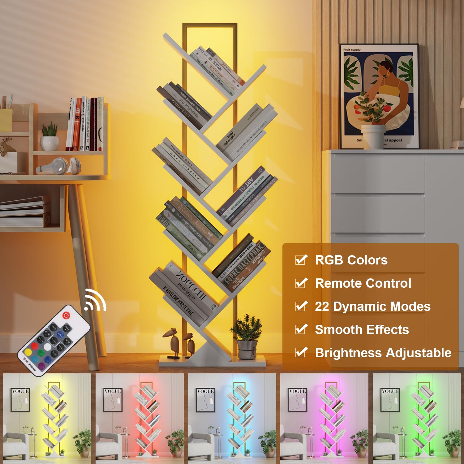 - Upgraded LED Tree Bookshelf: The newly upgraded LED bookshelf, equipped with a 3.3-foot USB cable and remote control, offers 22 dynamic modes, RGB colors, and adjustable brightness. It can also serve as a night light to ease the fear of darkness