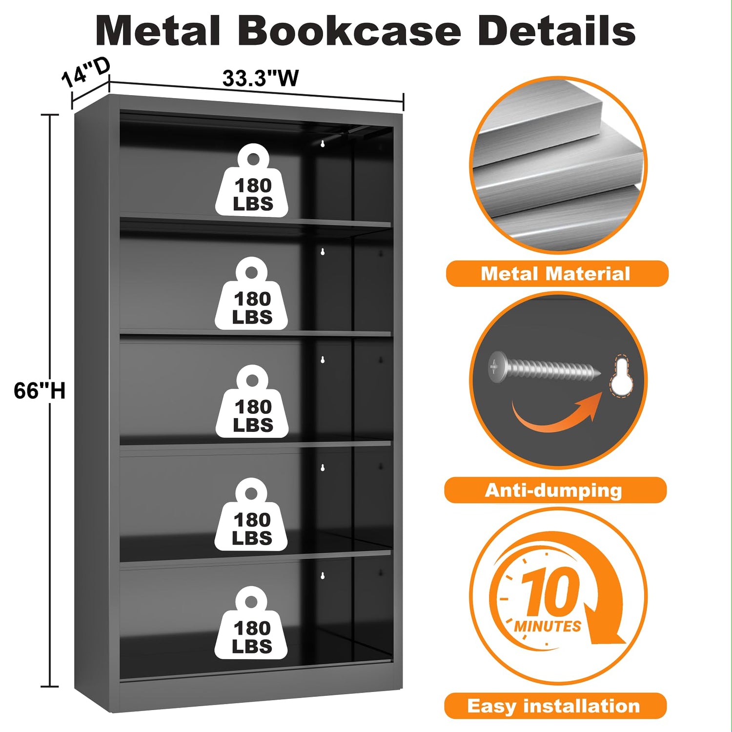 - Office Industrial Bookshelf Capacity: Constructed from solid cold-pressed steel, this tall book shelf supports up to 180 lbs per shelf, with a total weight capacity of 900 lbs. Bookshelves and bookcases steel back panels keep books clean and secure