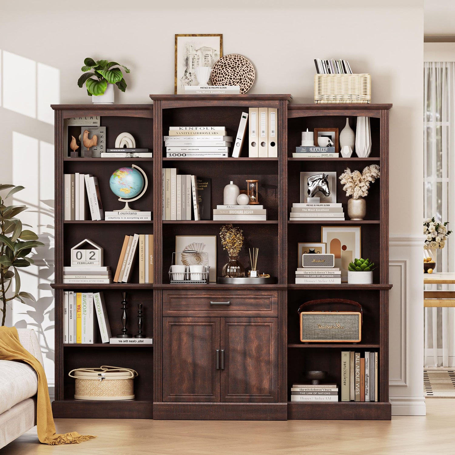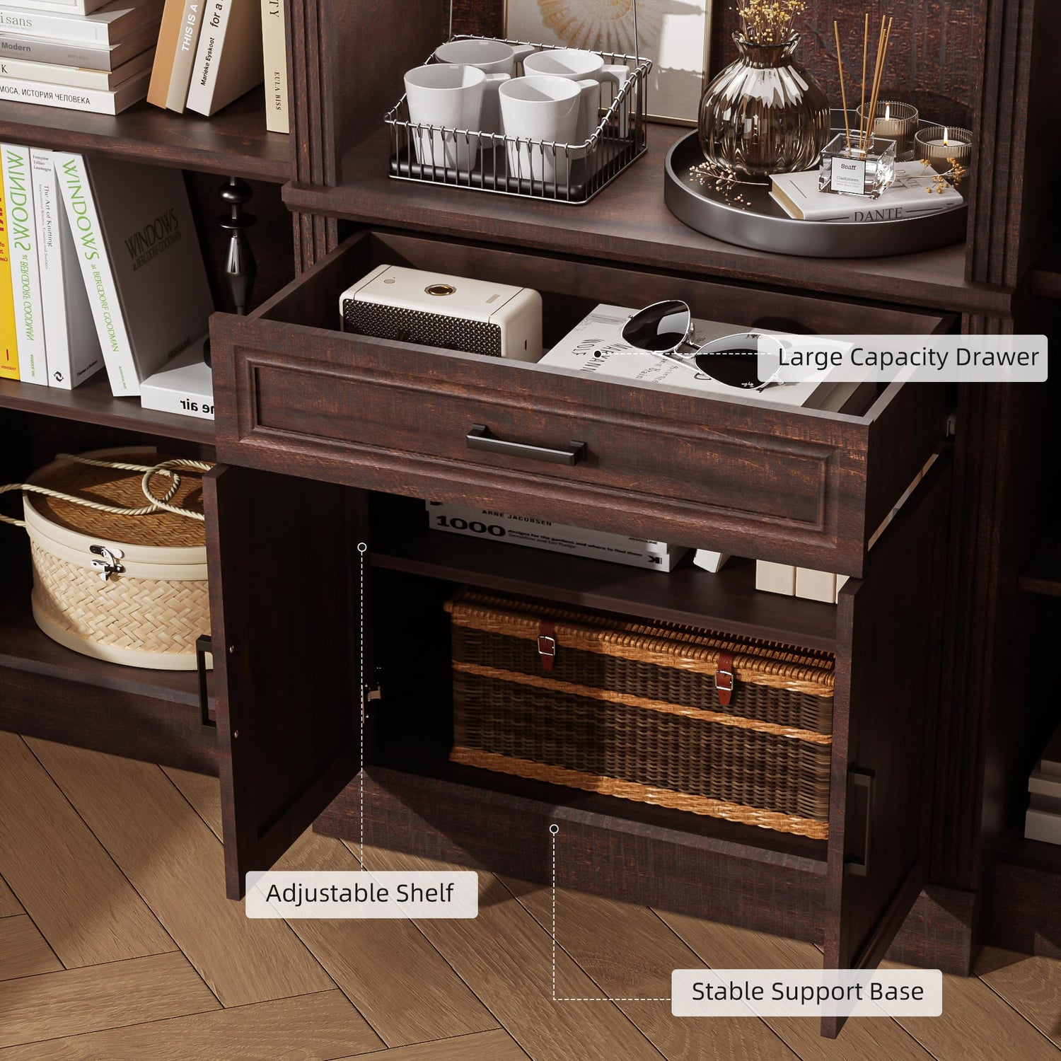 • Sturdy and Durable: The bookcase with shelves and doors is designed for safety and durability. The wider base and backboard fasteners make the bookcase more stable, and it equips with anti-tip hardware to secure the cabinet to the wall, preventing tipping accidents.