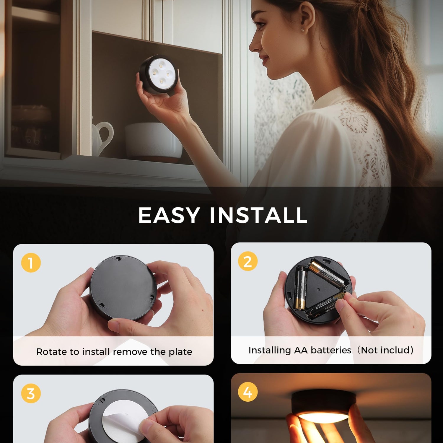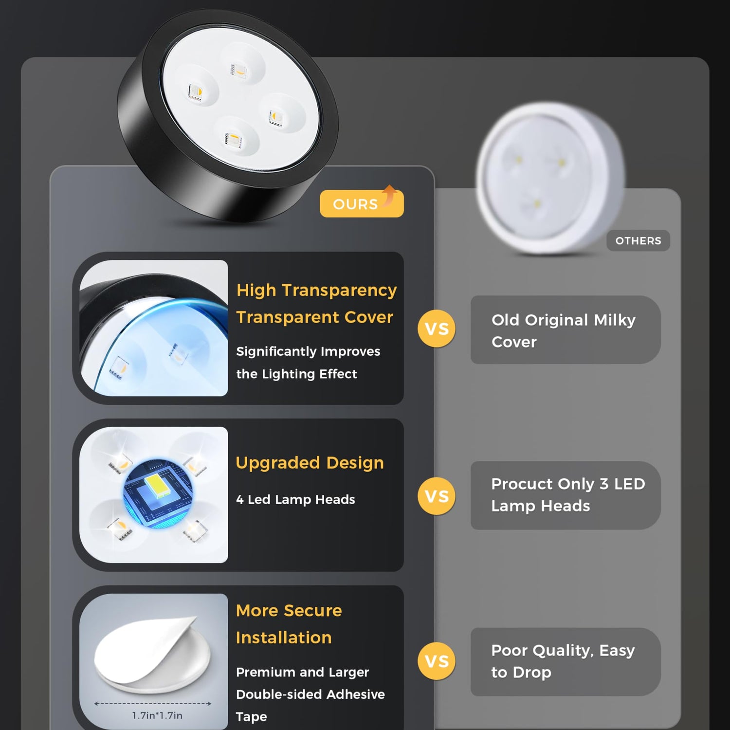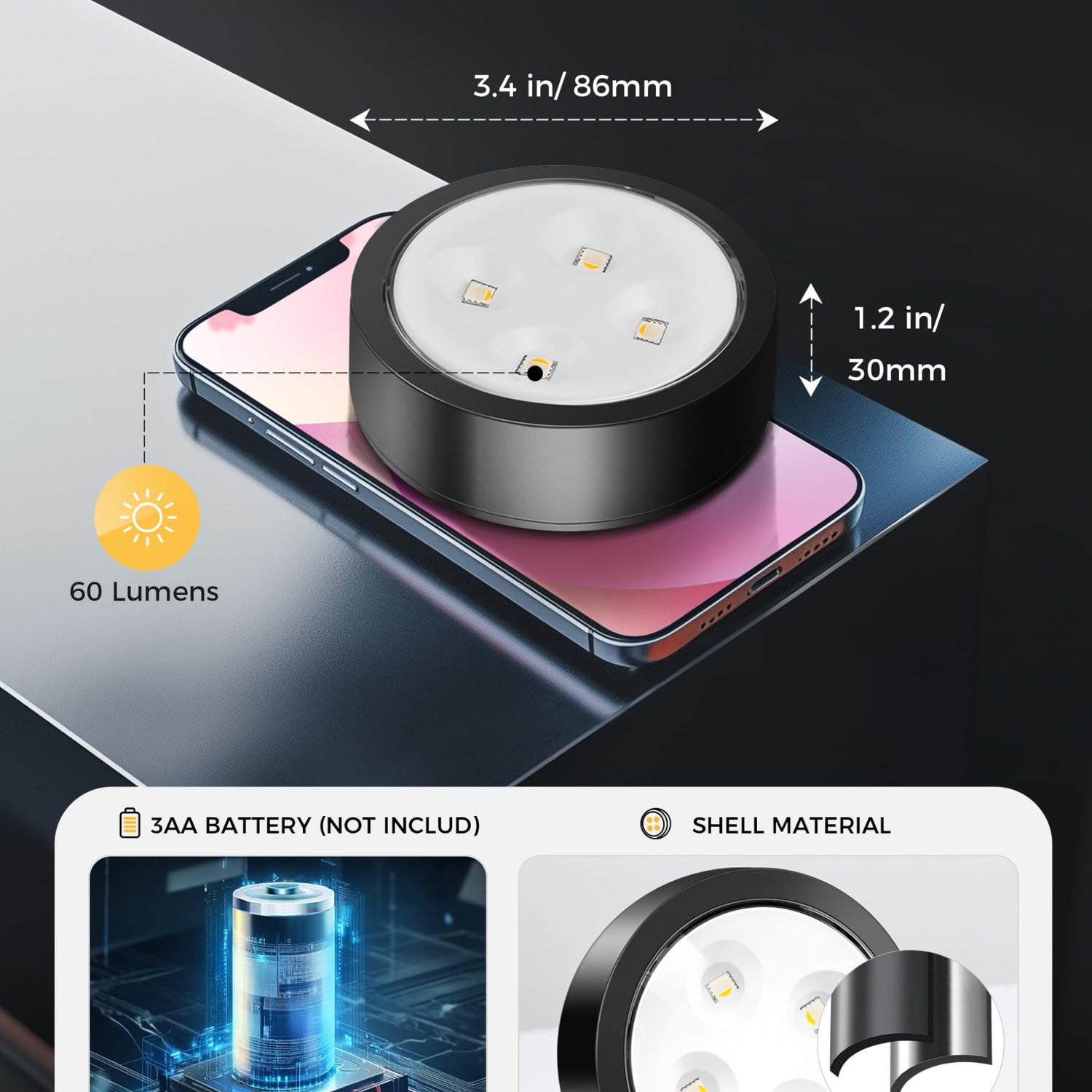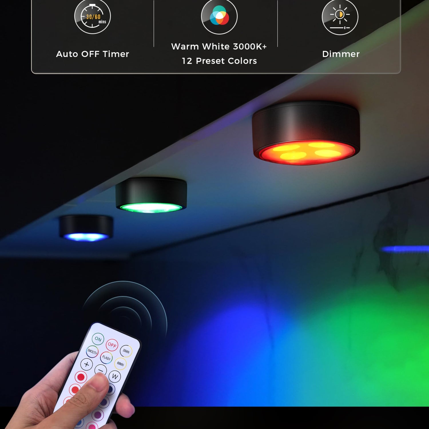 - PUCK LIGHTS WITH REMOTE: Brighten and change the mood in your home with colorful puck lights. Control your puck lights up close with a quick tap or from a distance with the convenient remote control. Customize your lights even more or set a timer using the remote too.