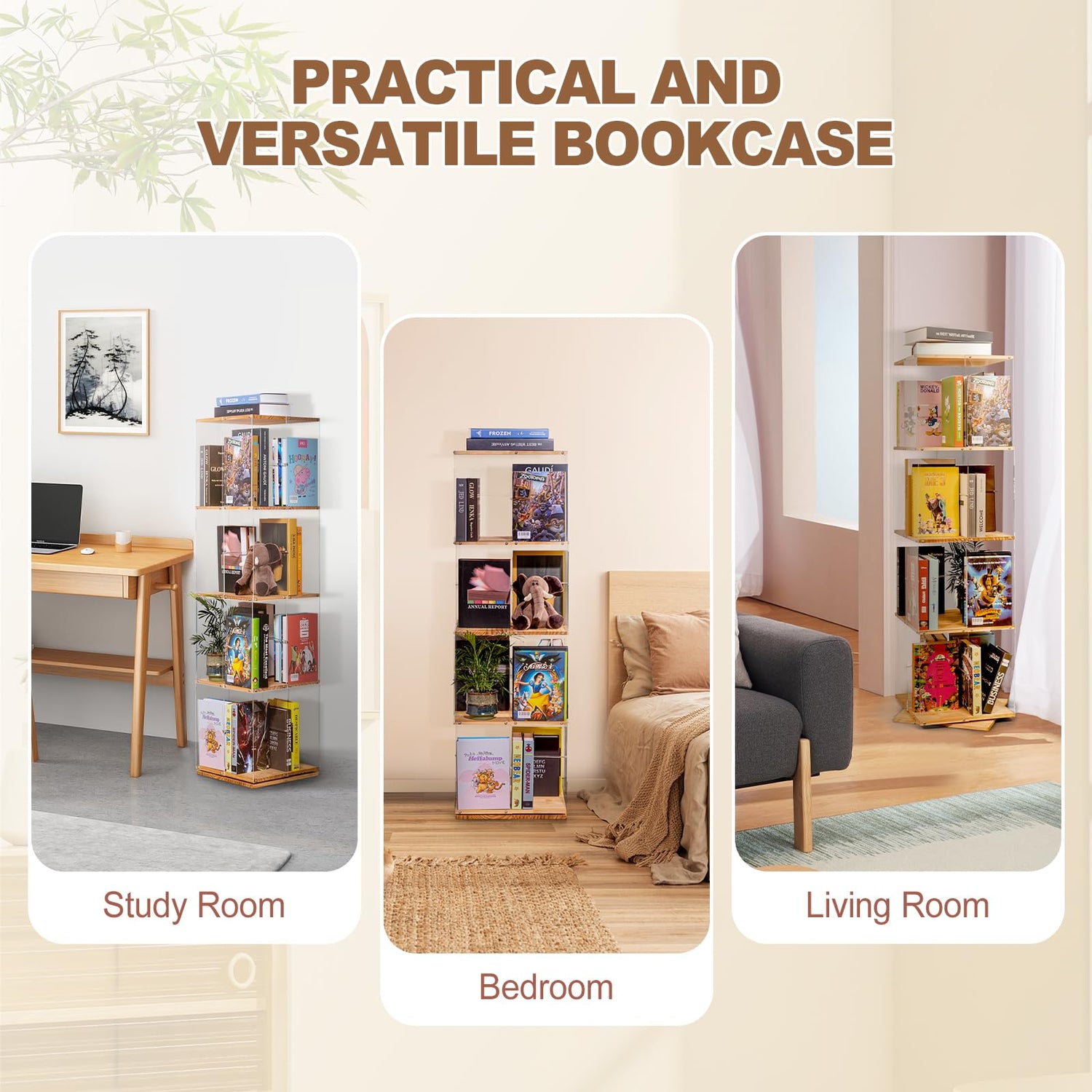 Introducing the TAKEKIT 360° Rotating 4-Tier Bookshelf, a perfect blend of functionality and elegance in clear acrylic and solid wood. This modern-chic revolving bookshelf is not just a furniture piece; it’s an investment in style and practicality that enhances any space, whether it's a child’s playroom, bedroom, or living room.
