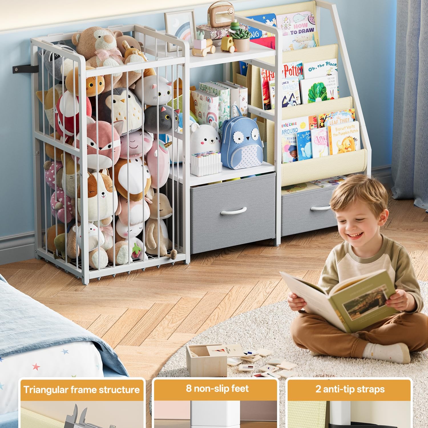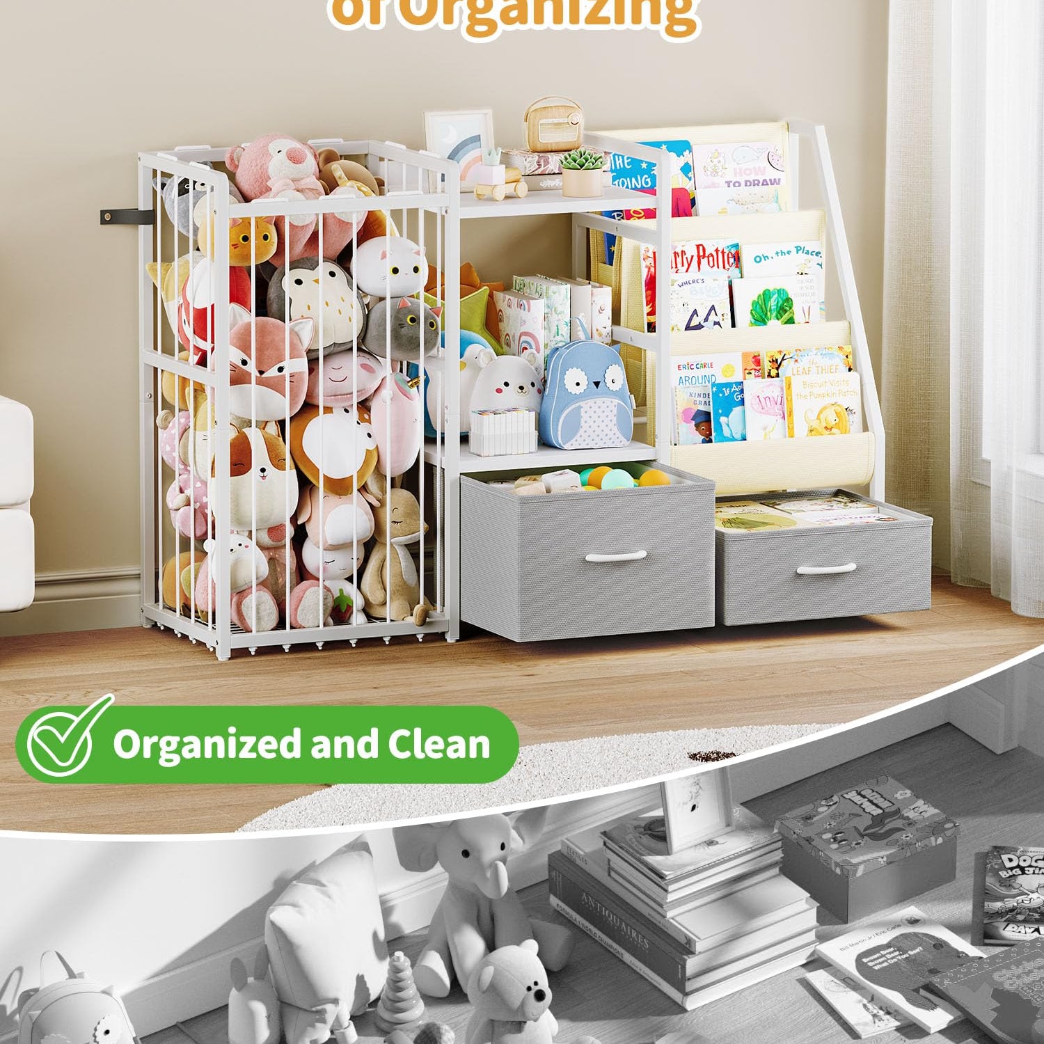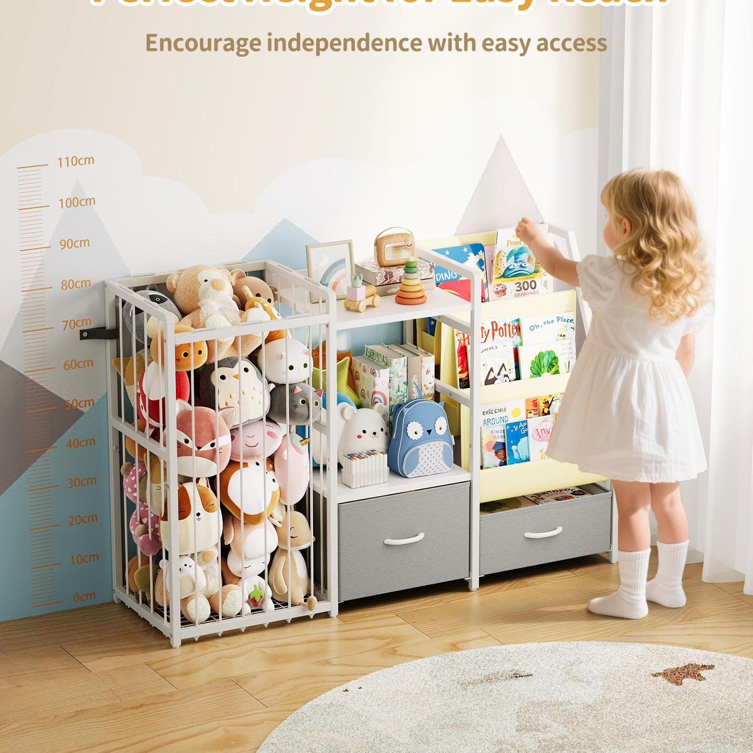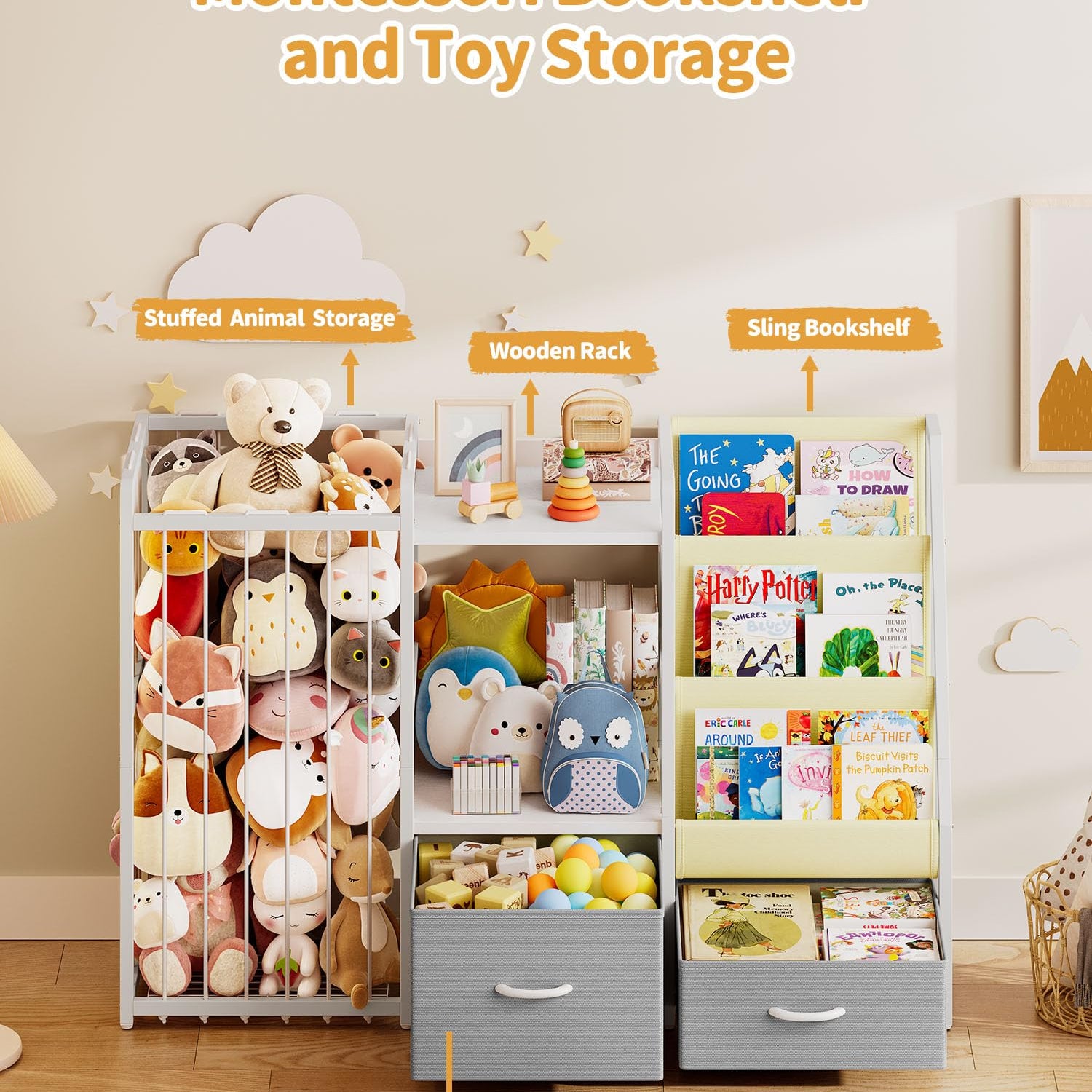 - Large Capacity Storage Space: Three-tier sling bookshelf for easy book access, spacious wooden toy shelf, and a stuffed animal storage compartment with elastic ropes; Plus, two large drawers at the bottom offer extra space for toys and miscellaneous items; This 3-in-1 design keeps everything tidy while fostering independence and good habits in children