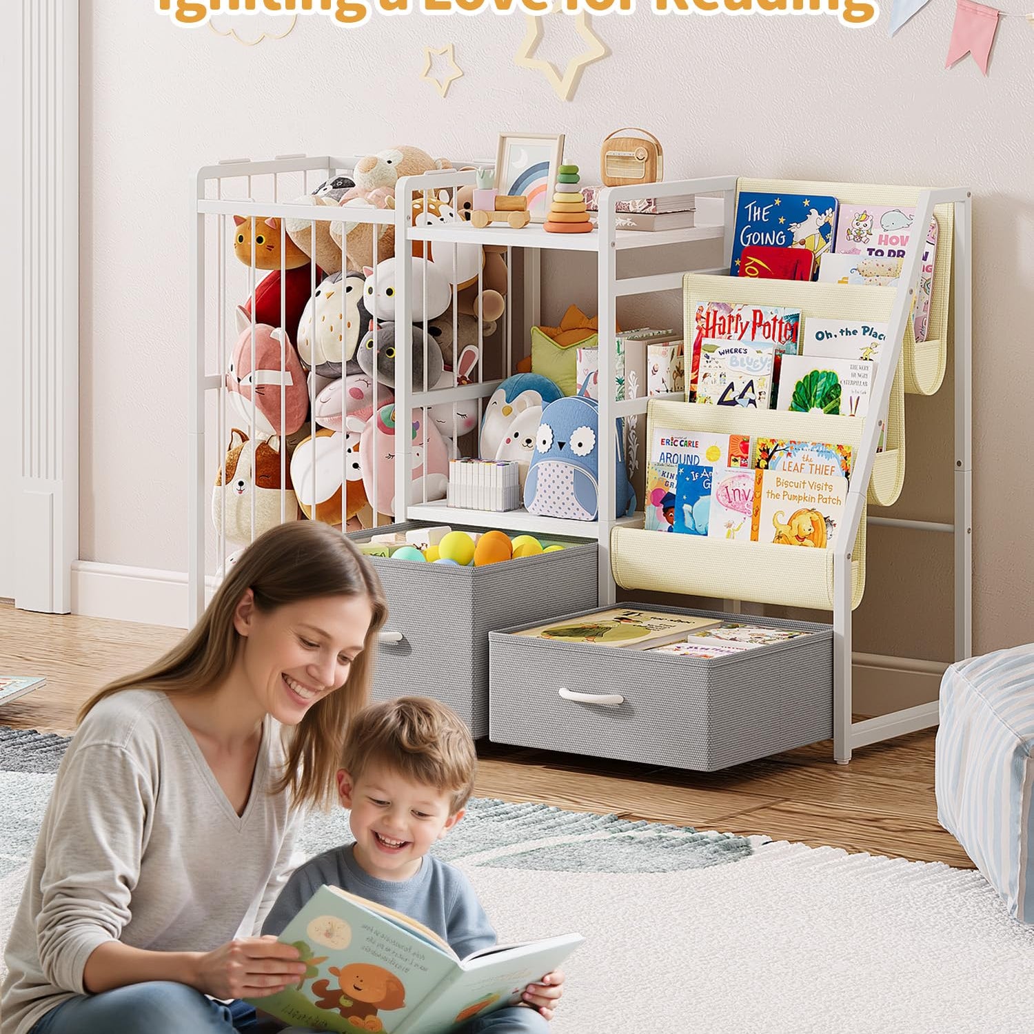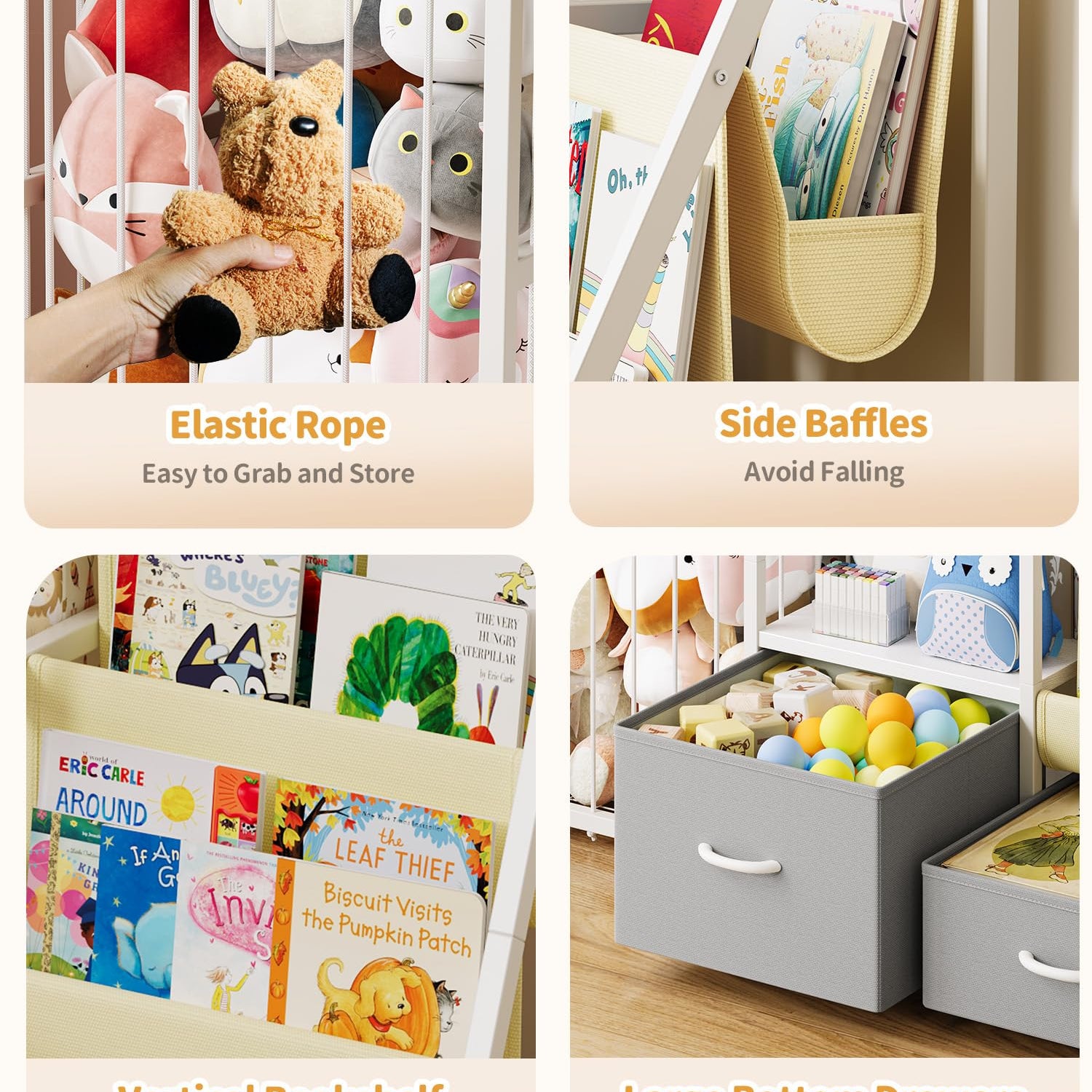 - Space-Saving & Stylish: Perfect for any room, this bookshelf and toy storage combines functionality with style; Its compact design saves space while keeping the play area tidy and organized; The modern look adds a touch of charm to nurseries, playrooms, or classrooms