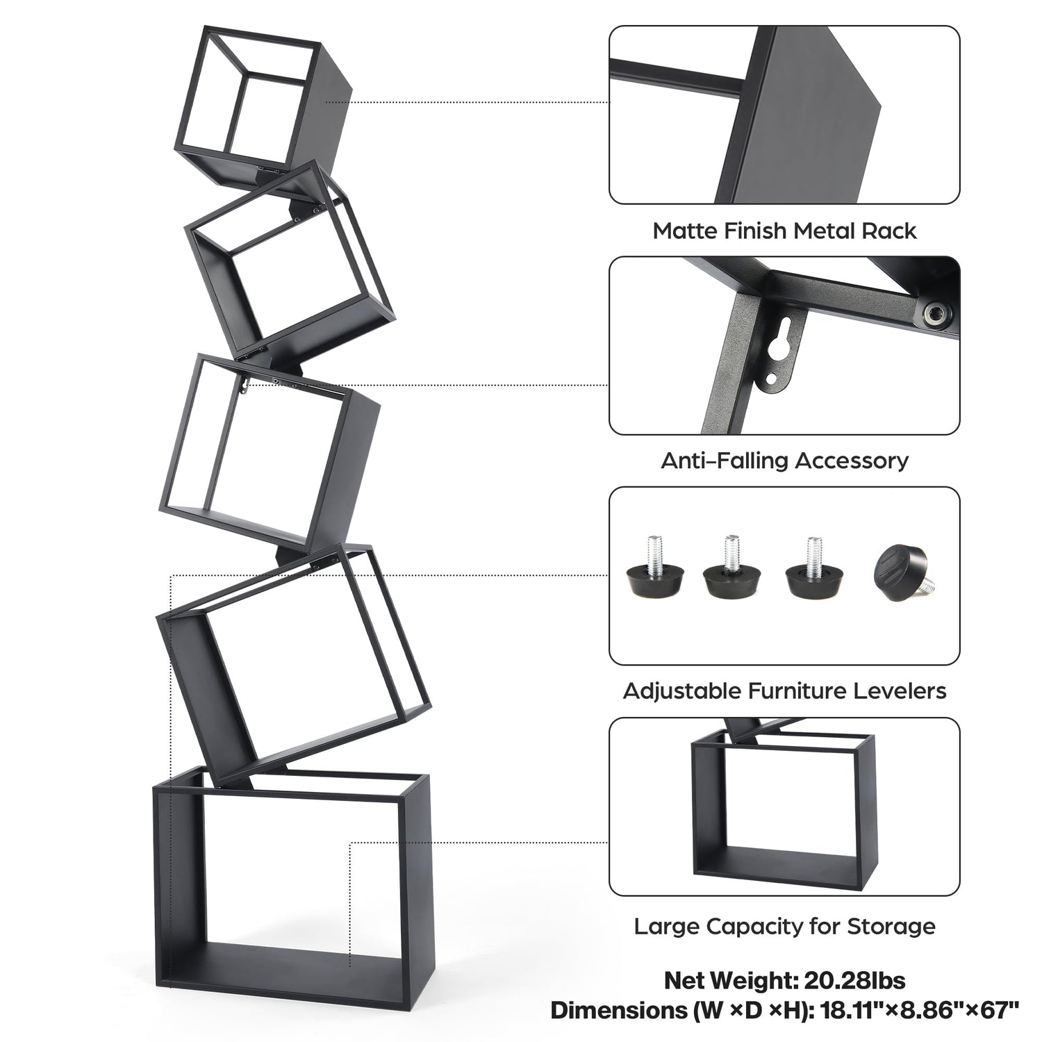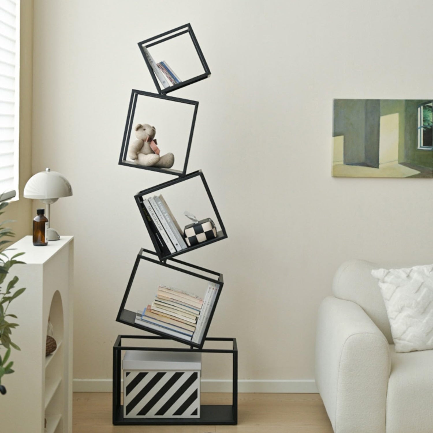 Its modern design features a playful shape and sleek black finish, making it a standout addition to contemporary homes. Measuring 18.11"×8.86"×67", this bookshelf fits seamlessly into various spaces such as the living room, bedroom, or nursery.
