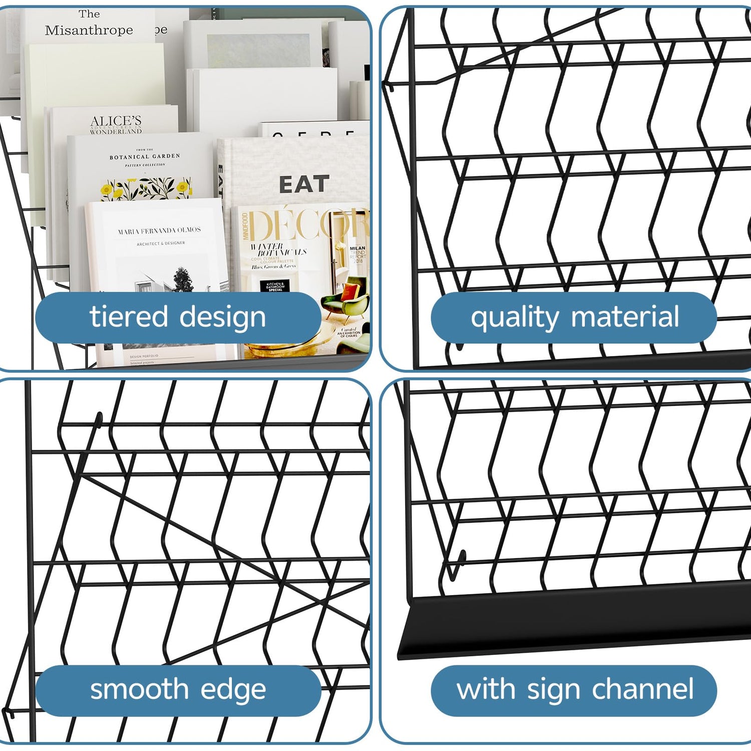 • Quality Display Rack: The wire display rack made of quality mental material.It is solid,stable and heavy duty,suitable to display varied sized brochures