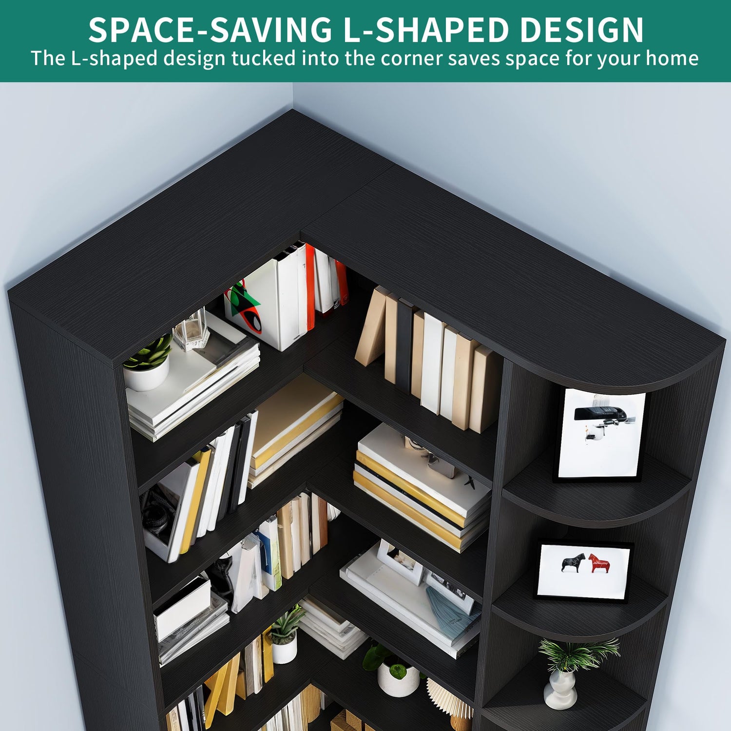 • Elegant Assortment: Elevate your space with this black corner book shelf. Its six tiers offer endless display or storage possibilities, while its modern design adds sophistication to any room. Ideal for a cozy reading nook or a stunning centerpiece