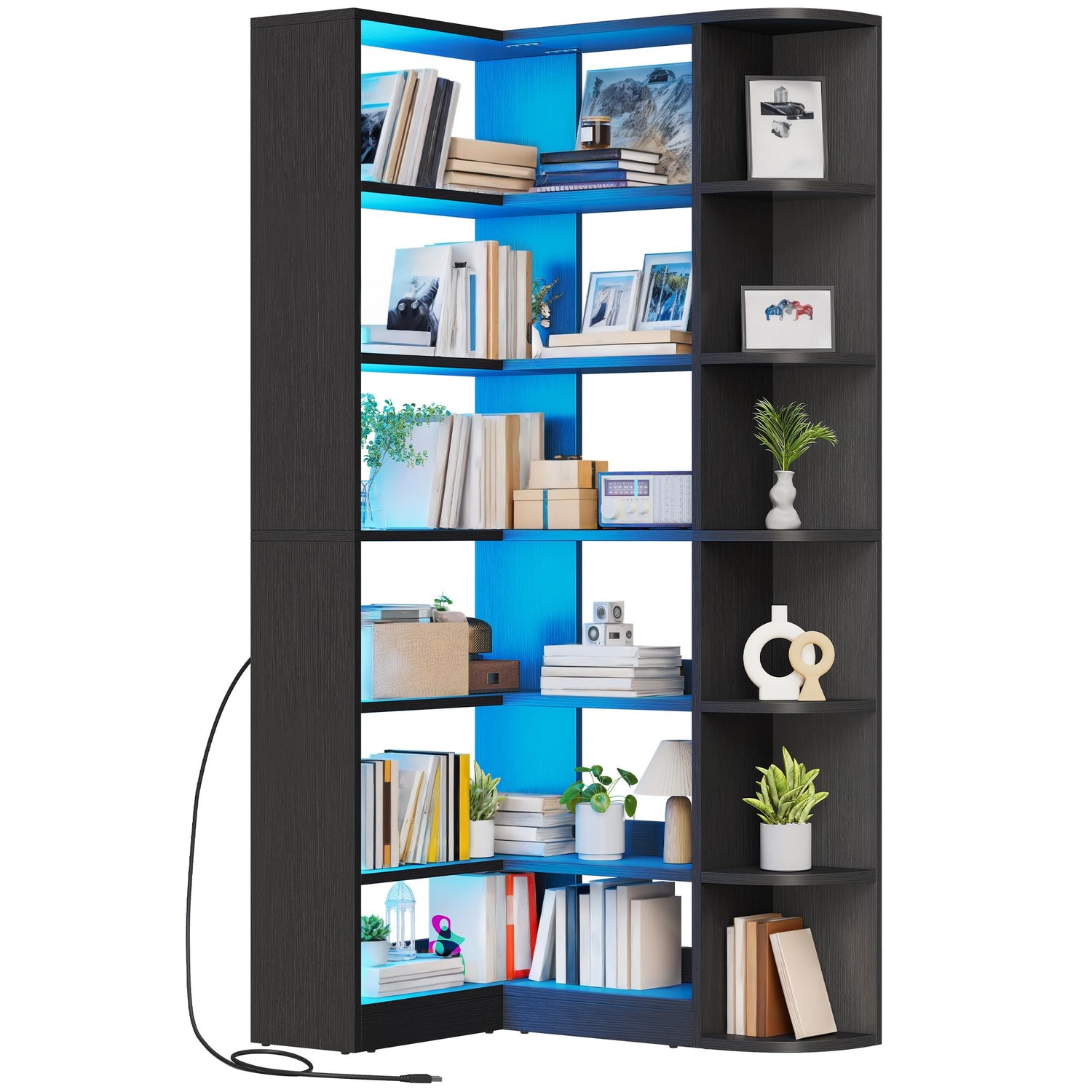 YITAHOME Corner Bookshelf and Bookcase with LED Light, Black Bookshelf 6 Tier Corner Shelf L-Shaped Bookcase Storage Display Shelf for Home Office, Living Room, Bedroom, Black