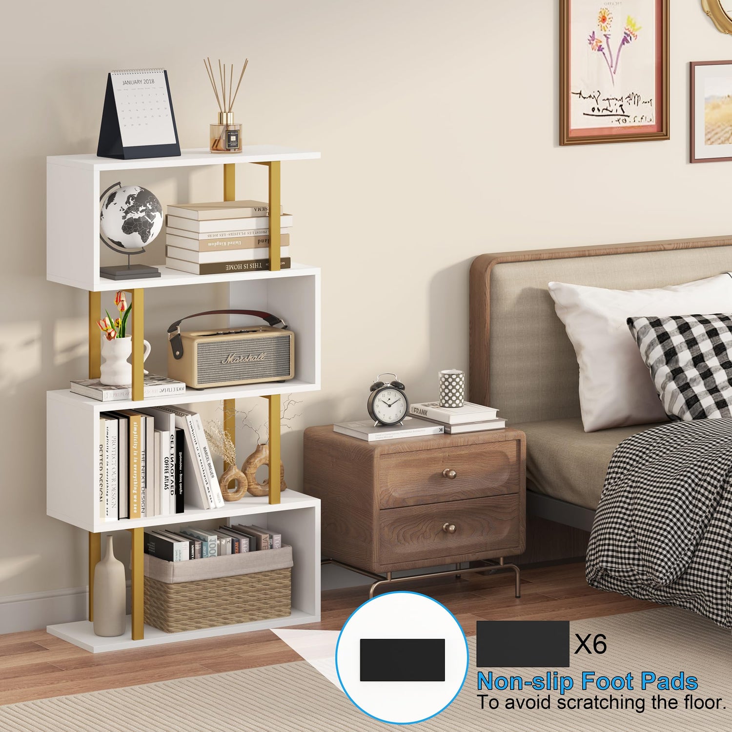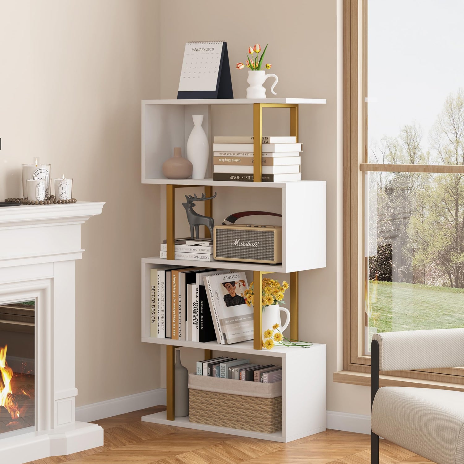 Yusong Geometric Bookcase, S Shaped Bookshelf 4-Tier Book Shelves for Bedroom, Modern Wood Decorative Display Shelf Tall Book Case for Home Office, Gold and White