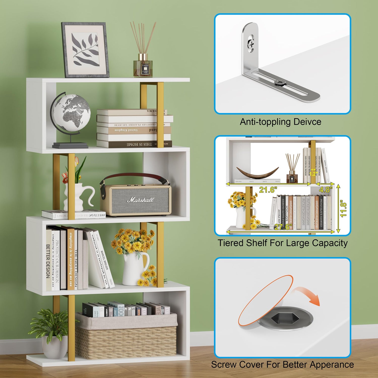 - 【Modern S-shaped Bookshelf】Unique Geometric Design makes our bookcase a stylish home office piece. 6-tier vertical storage space satisfies various needs. Works well as a book shelf, display cabinet or room divider in your living room, bedroom, office, hallway, porch...