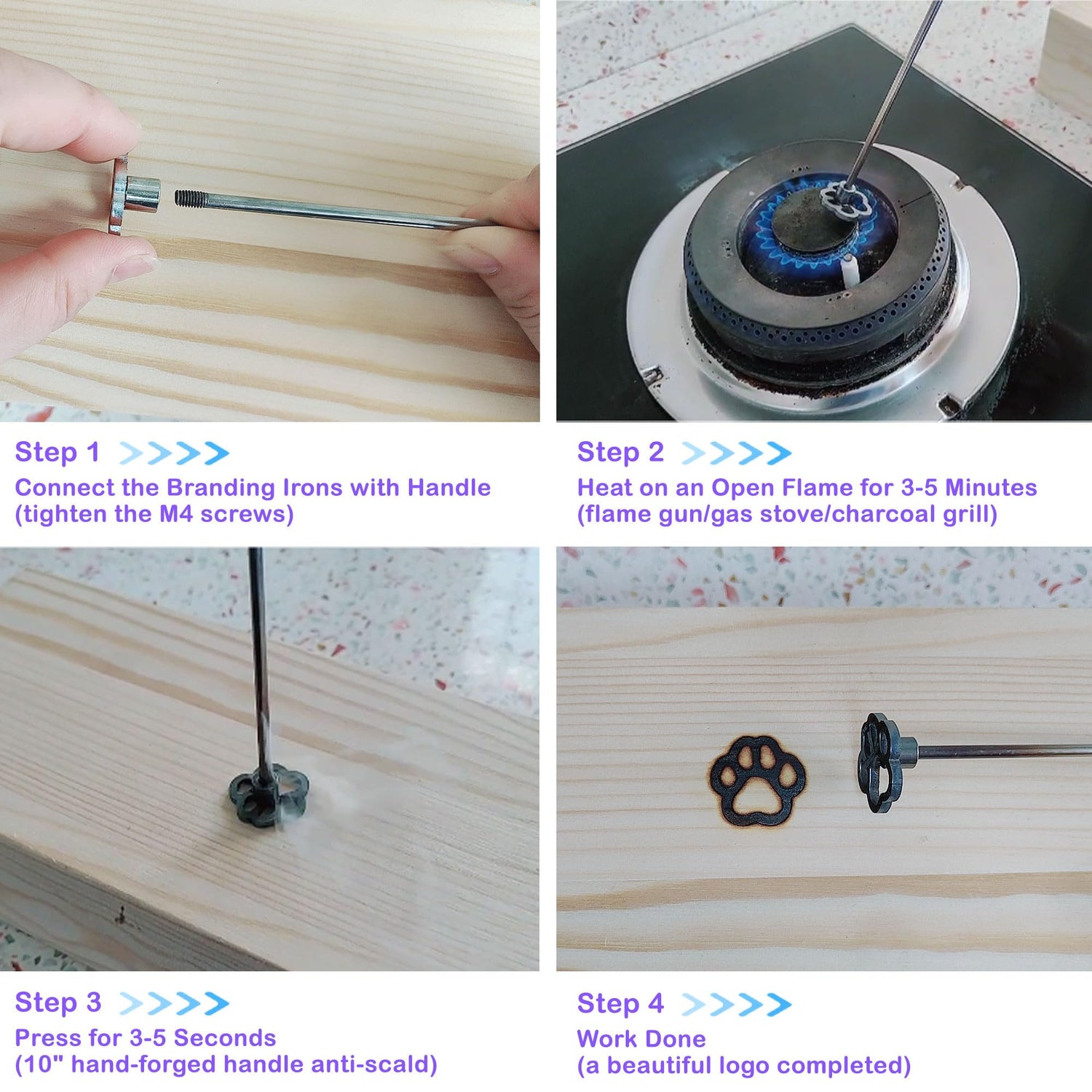 - **User-Friendly Operation**: The process is simple: attach the branding iron to the handle, heat it using an open flame for 3-5 minutes, then press it onto your craft for 3-5 seconds. It's that easy—enjoy the satisfaction of completing beautiful handcrafted pieces.