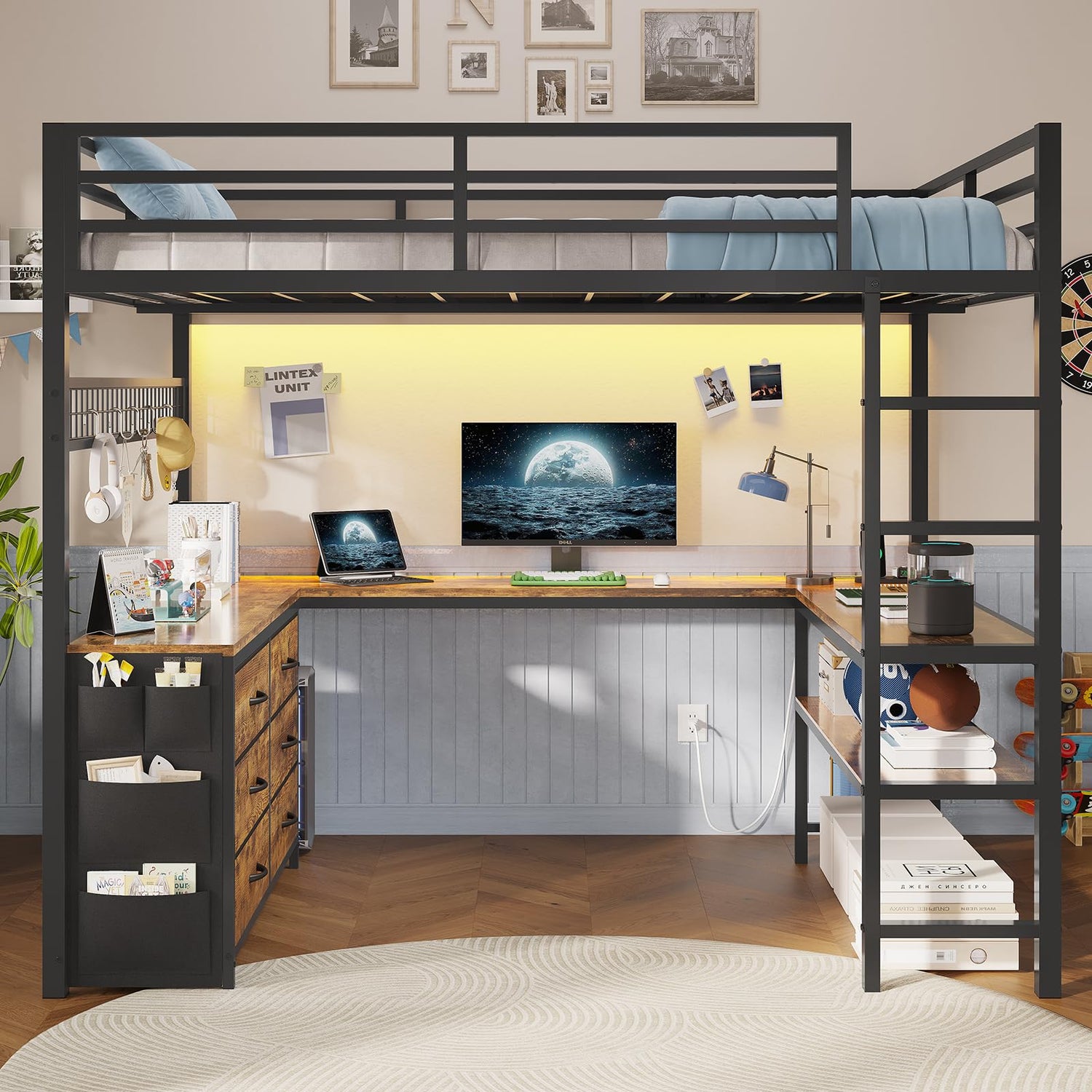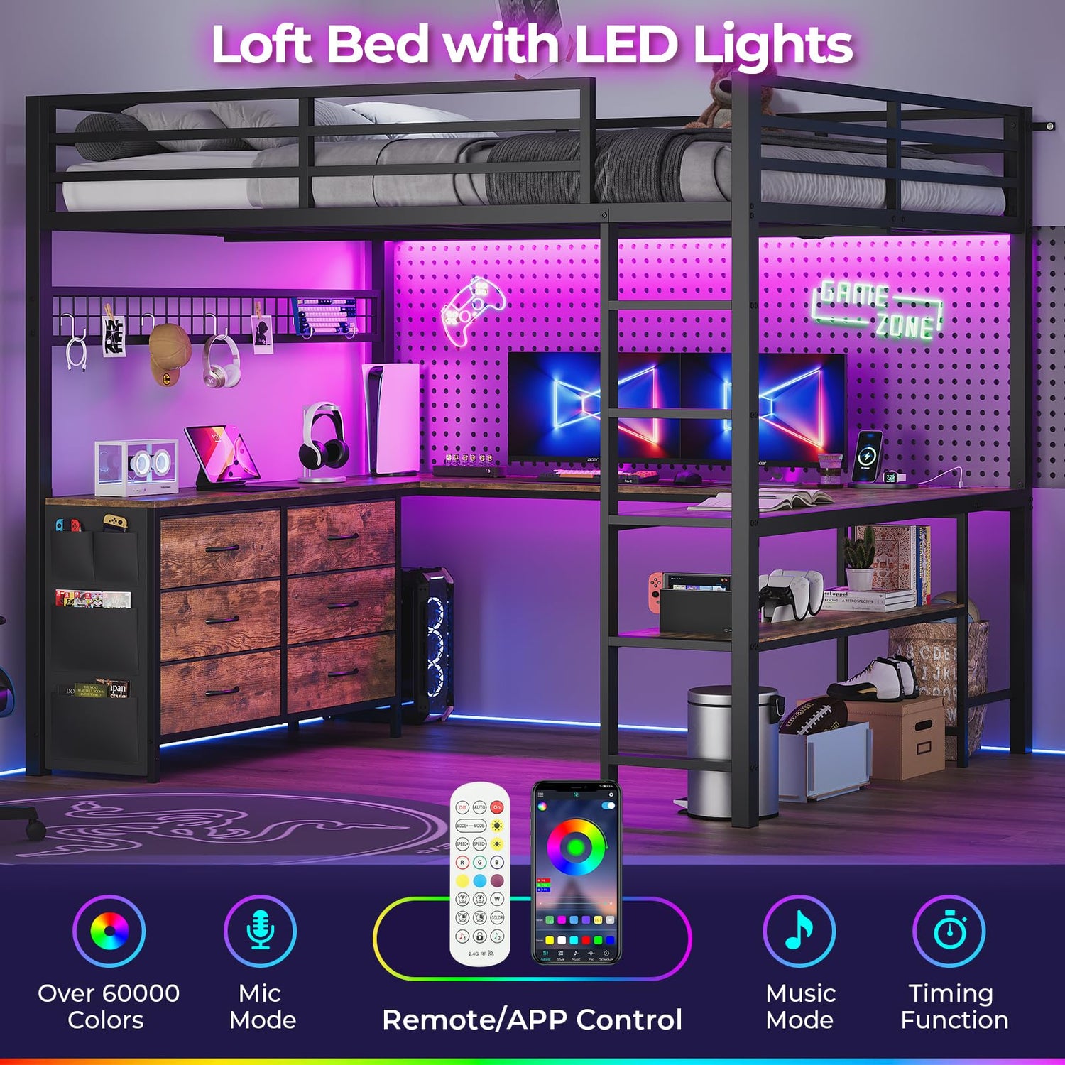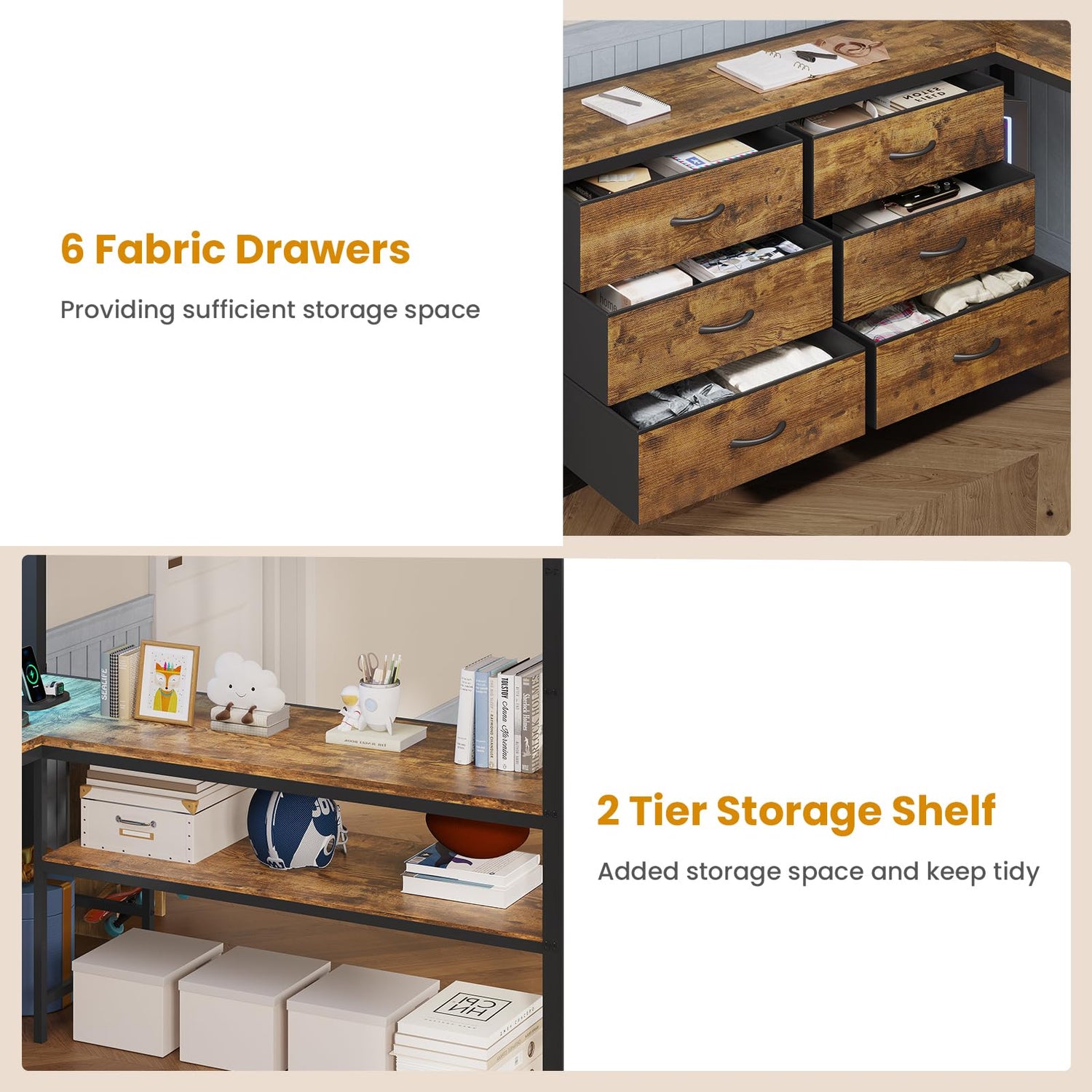 ADORNEVE Loft Bed Full Size with U-Shaped Desk, 6 Storage Drawers, Power Outlet, LED Metal Loft Bed with 2 Storage Shelves, Bed with Safety Guardrail & Ladders, No Box Spring Needed, Rustic Brown