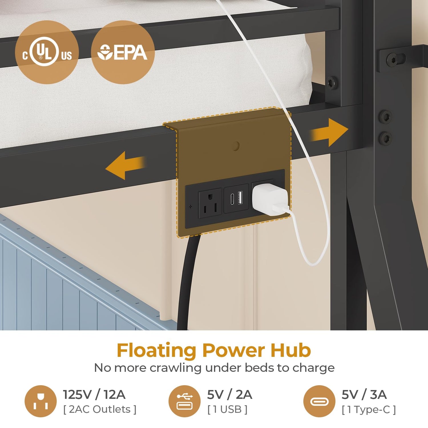 • Floating Power Hub: The kids bed comes with a suspended power outlet. Two AC outlets, USB-A, and USB-C keep devices juiced up without cluttering the floor. Kiddo in the upper bunk now juice up their devices conveniently now