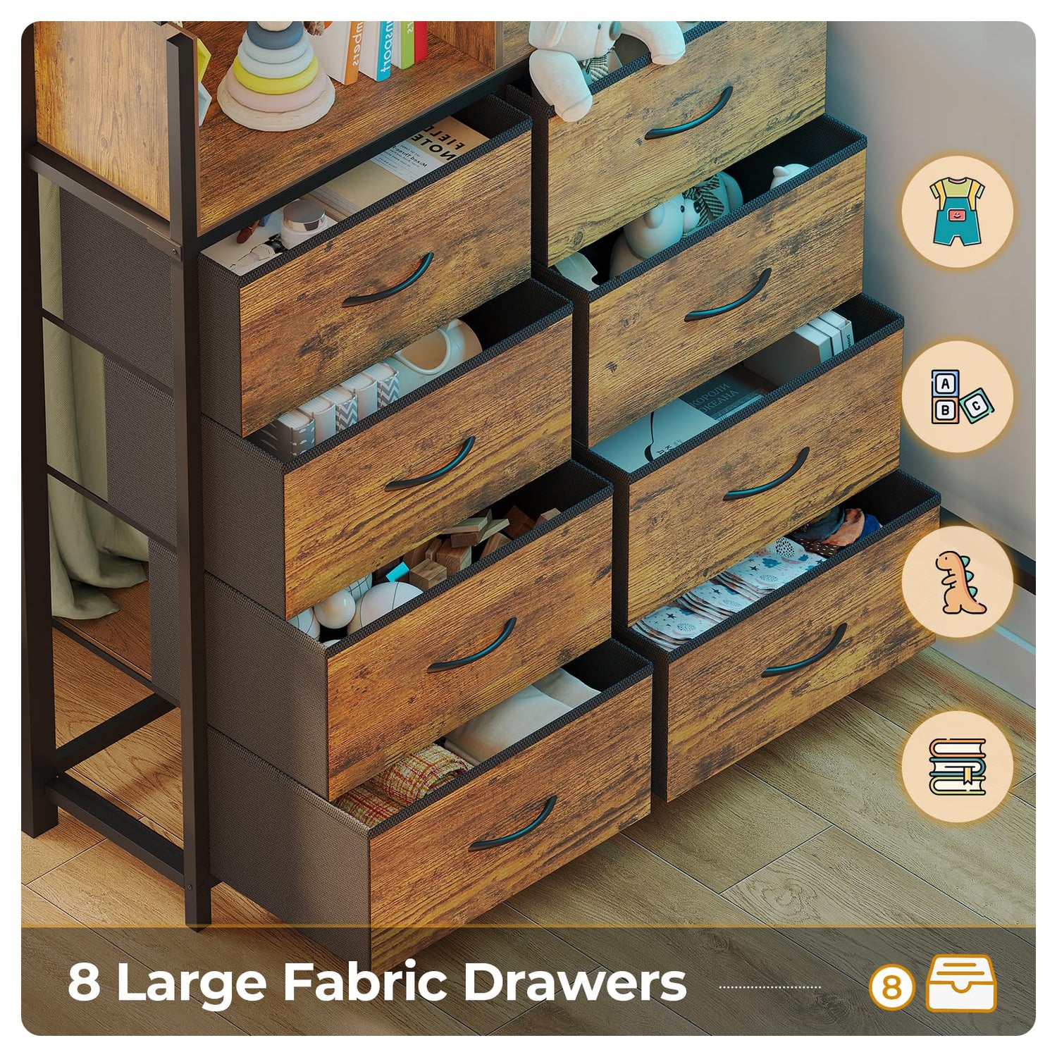 ADORNEVE Twin Size Loft Bed with Desk and 8 Storage Drawers, Metal Kids Loft Bed Twin with LED Lights & Charging Sation, Storage Shelves, 13.1" H Safety Guard & Ladder, Rustic Brown