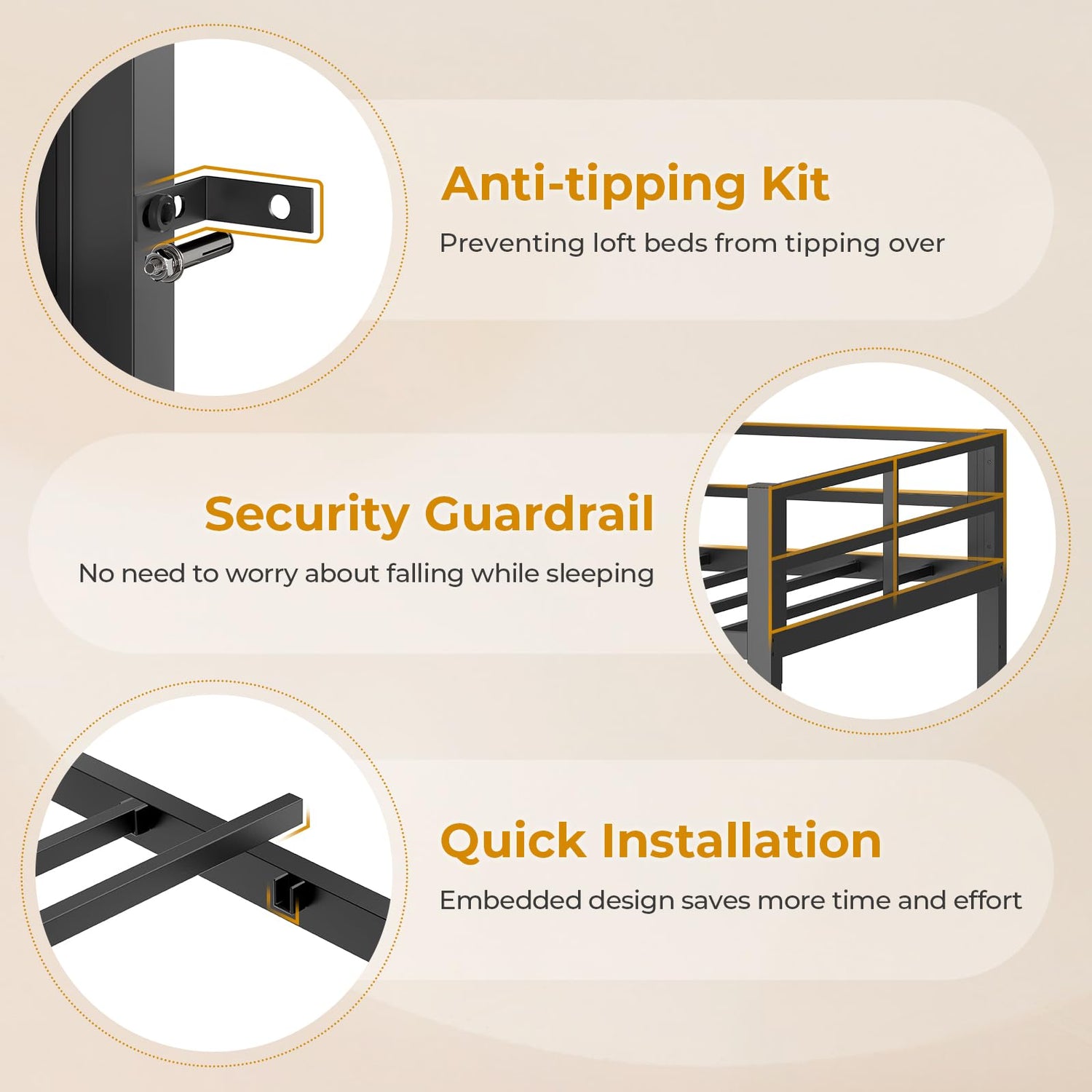 - 【Safety Bunk Bed】-Our safety Loft bed features a full-length 13.1”H guardrail on the top bunk, ensuring that the sleeper is protected at all times. with anti-tip devices, this loft bed offers extra stability, ensuring it remains firmly in place.Whether it's for your kids or guests, you can rest assured knowing that safety is our top priority