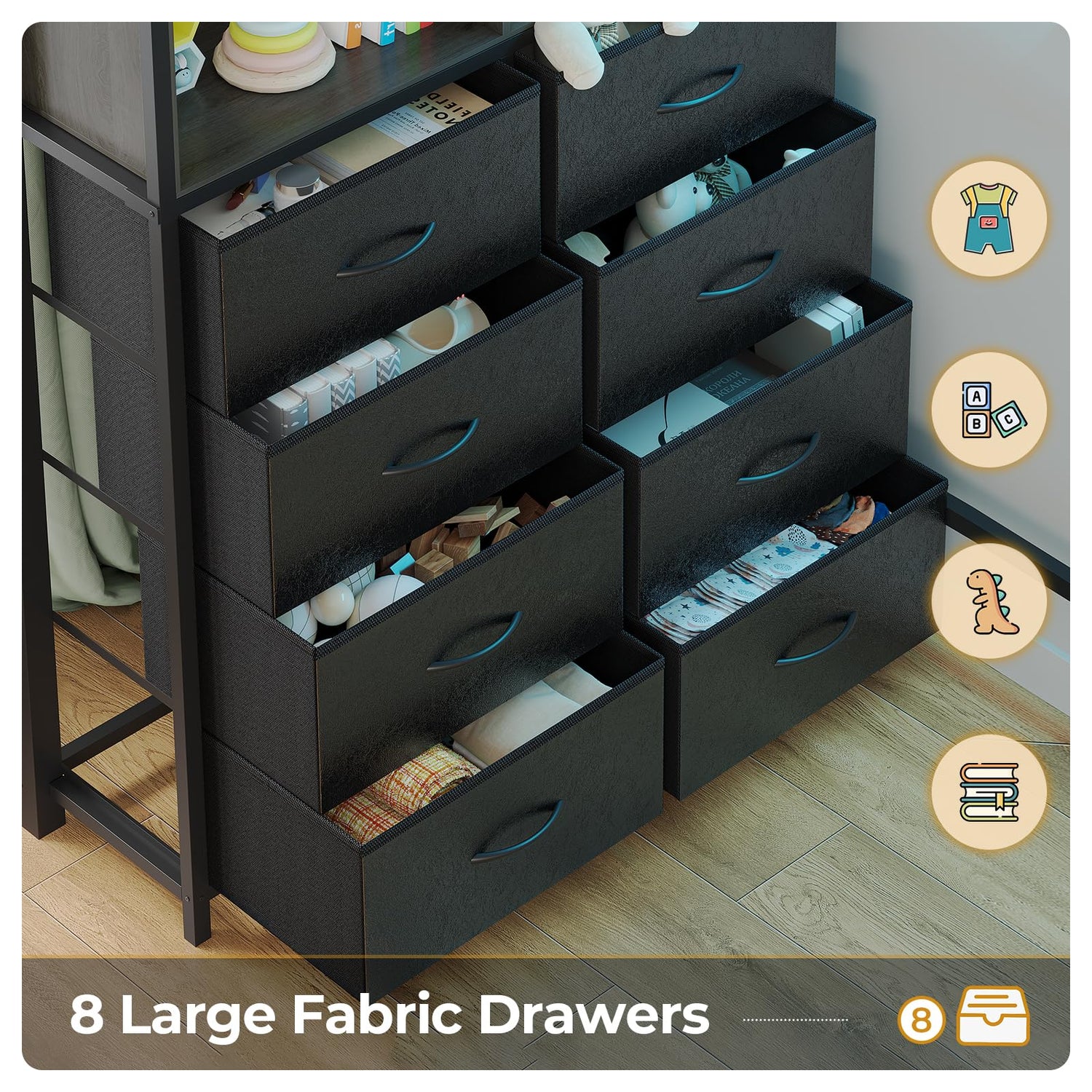 - 【Multifunction Storage Space Loft Bed】-The twin loft bed frame with powerful storage space,Features 8 extra-large fabric drawers for organizing books, documents, clothes, toys,and decorations, 2 open storage shelves for quick access to essentials,7 S hooks for effortless storage of small items, Designed to declutter and optimize your kids living space
