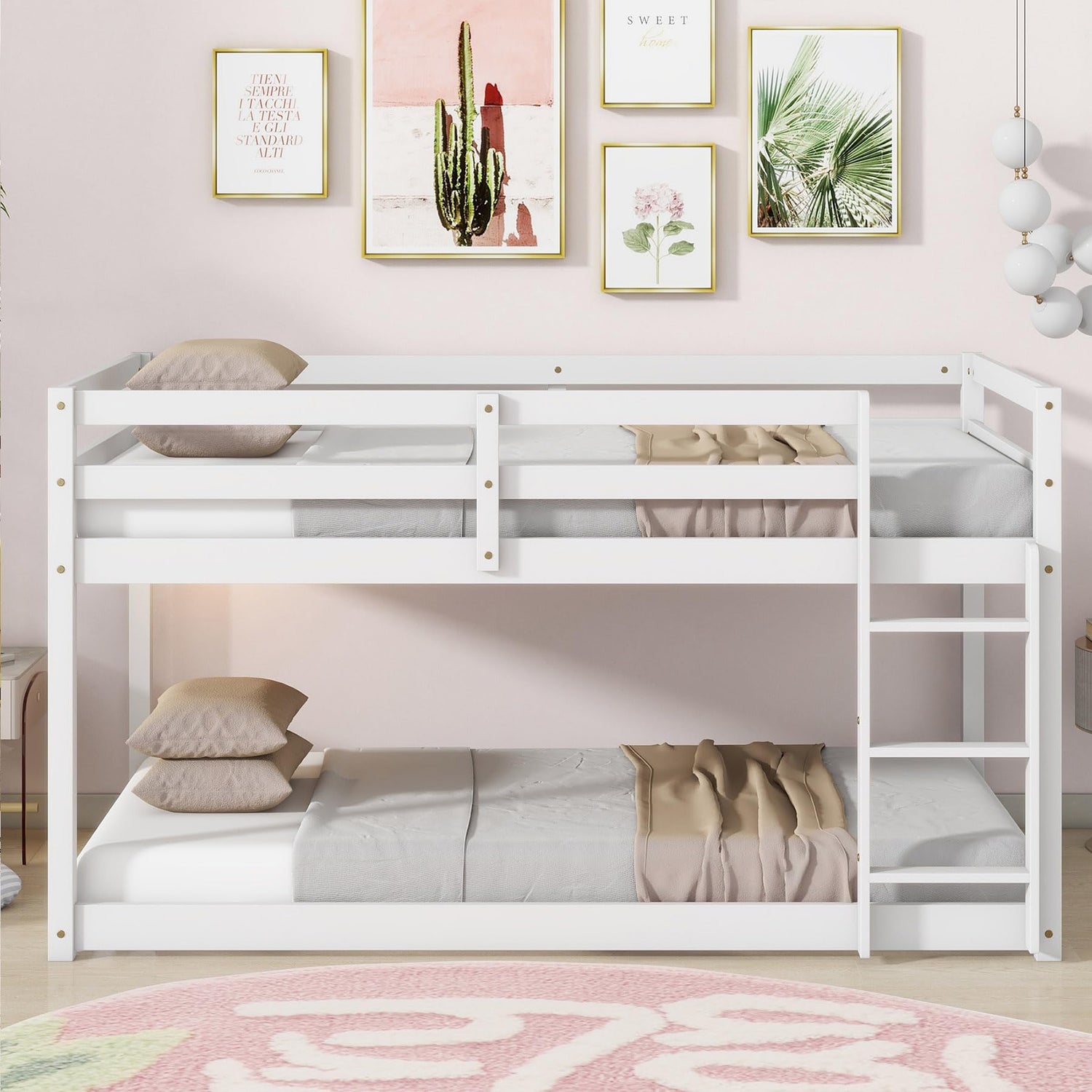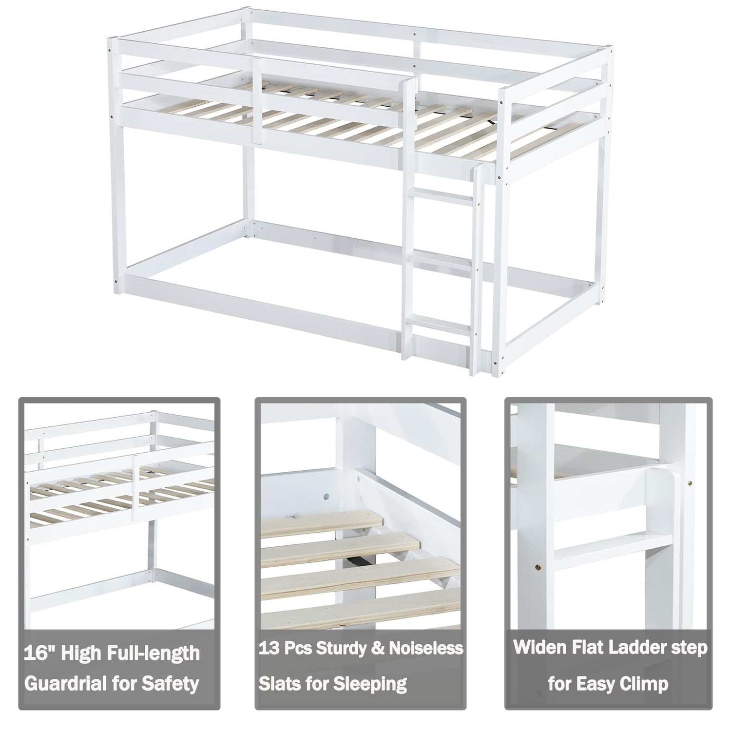 Anwick Low Bunk Bed Twin Over Twin, Floor Bunk Bed with Stairs, Twin Bunk Bed with High Rails Guardrail, Wooden Bunk Beds for Kids Girls Boys, No Box Spring Needed (White)