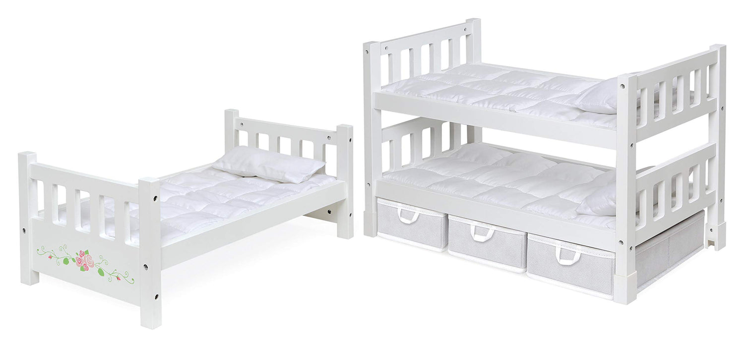 Badger Basket 1-2-3 Convertible Doll Bunk Bed with Bedding and Storage Baskets – Elegant White and Rose Design for 18 to 20-Inch Dolls