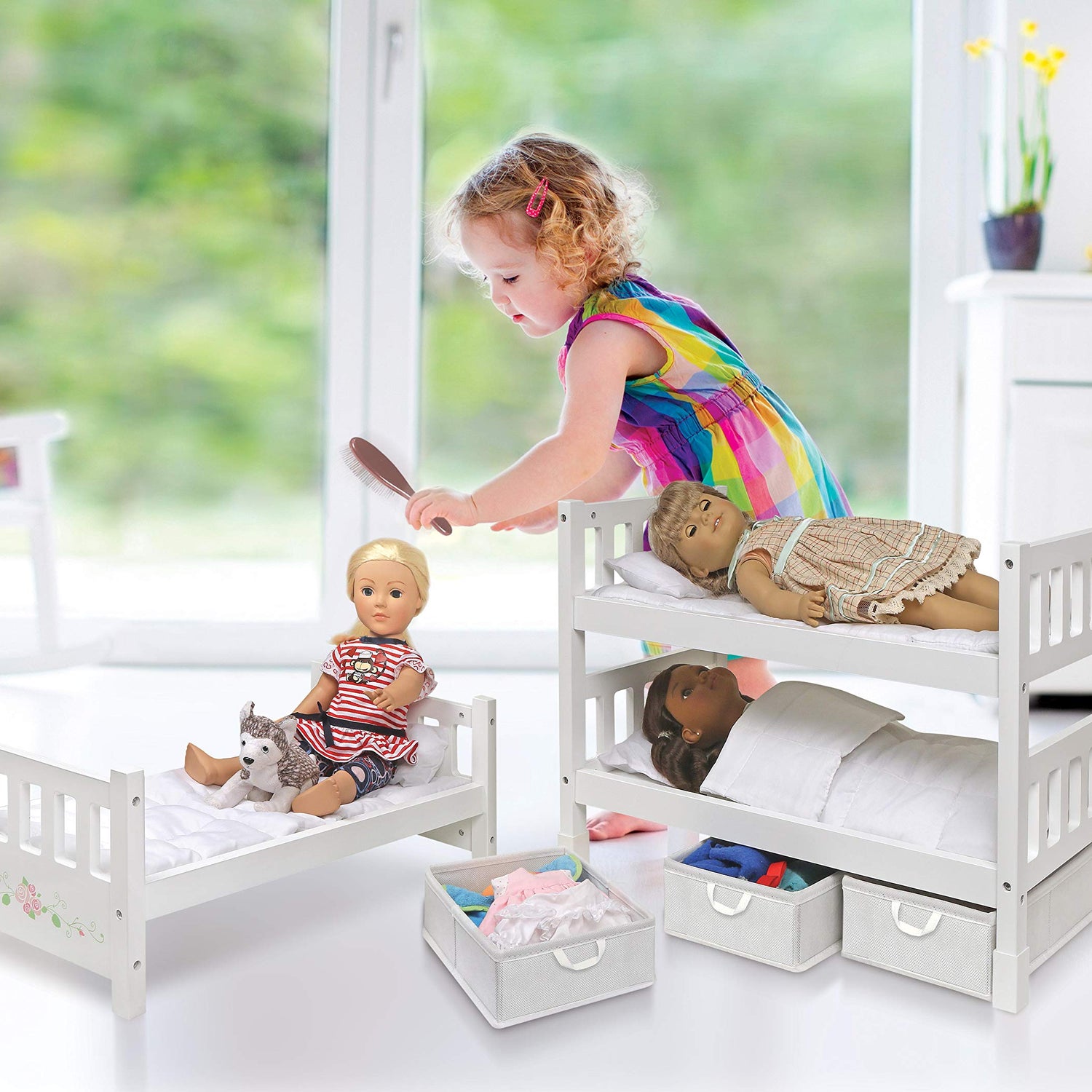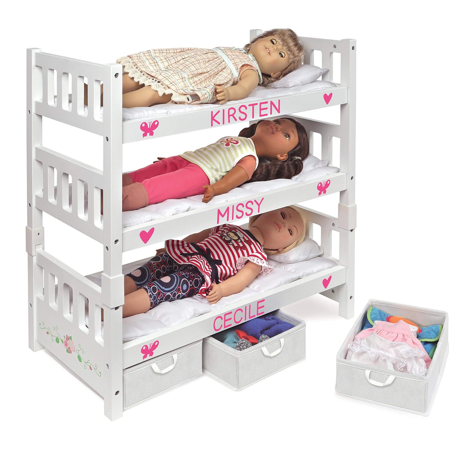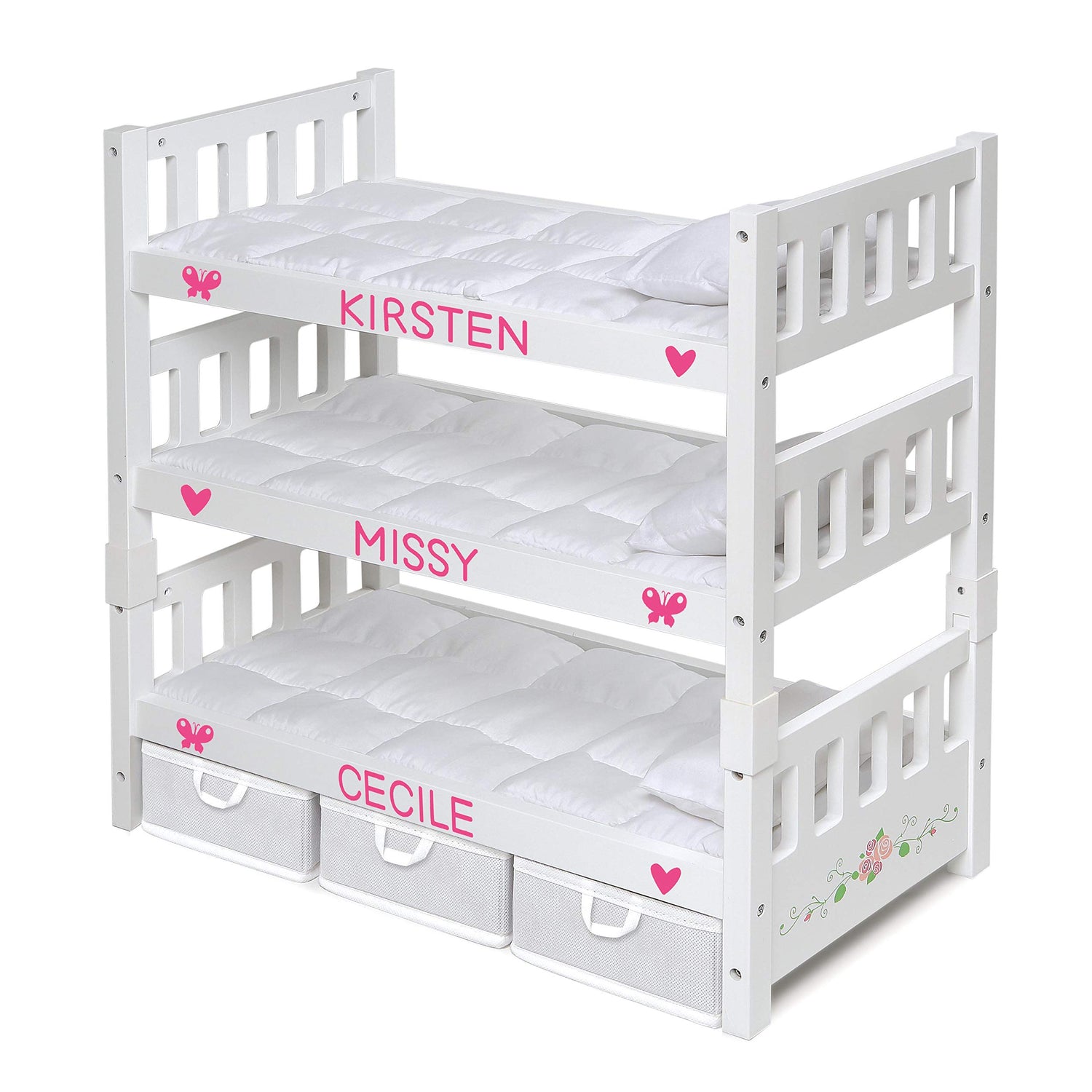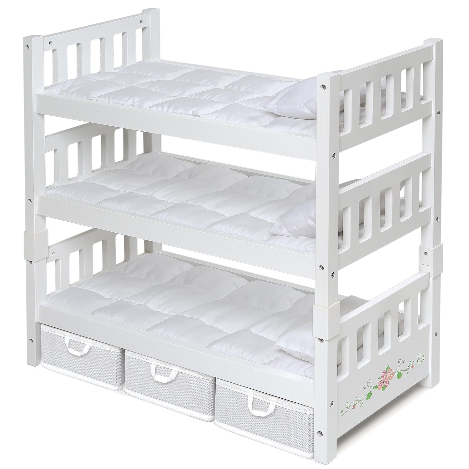 Details: Introducing the Badger Basket Doll Bunk Bed, a beautifully crafted and versatile playtime essential. This charming white rose bed can effortlessly transform from a triple bunk to separate double and single beds, offering endless adaptability for imaginative scenarios. Designed to fit dolls up to 20 inches, it’s compatible with all popular brands, ensuring seamless integration with your child's collection. The set includes cozy bedding, three fabric storage bins to keep accessories organized and easily accessible, and a personalization kit. Made from durable wood, this bunk bed not only looks stunning but is built to endure years of play, making it a trusted choice from family-owned Badger Basket. This item is a toy and is not intended for use with real babies.