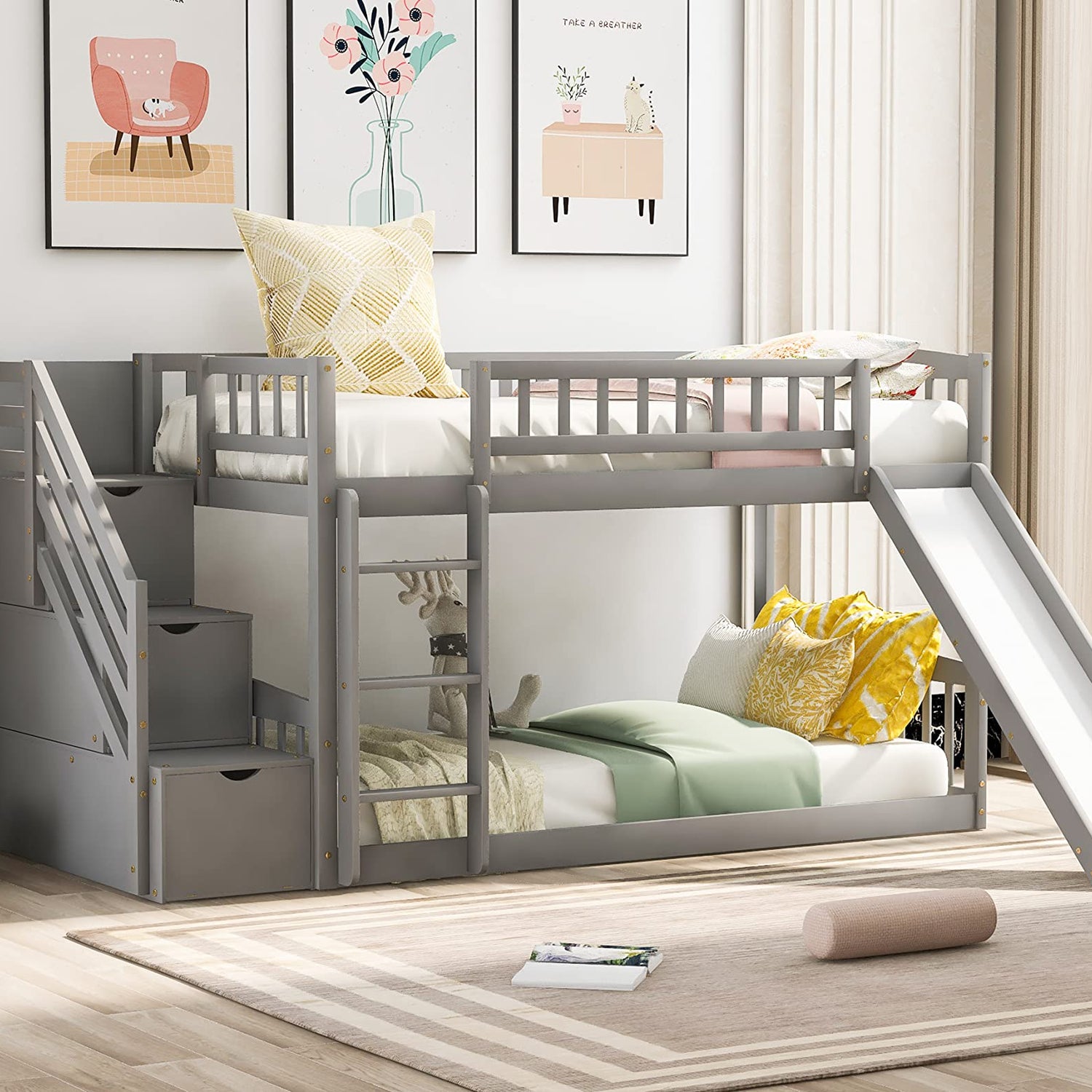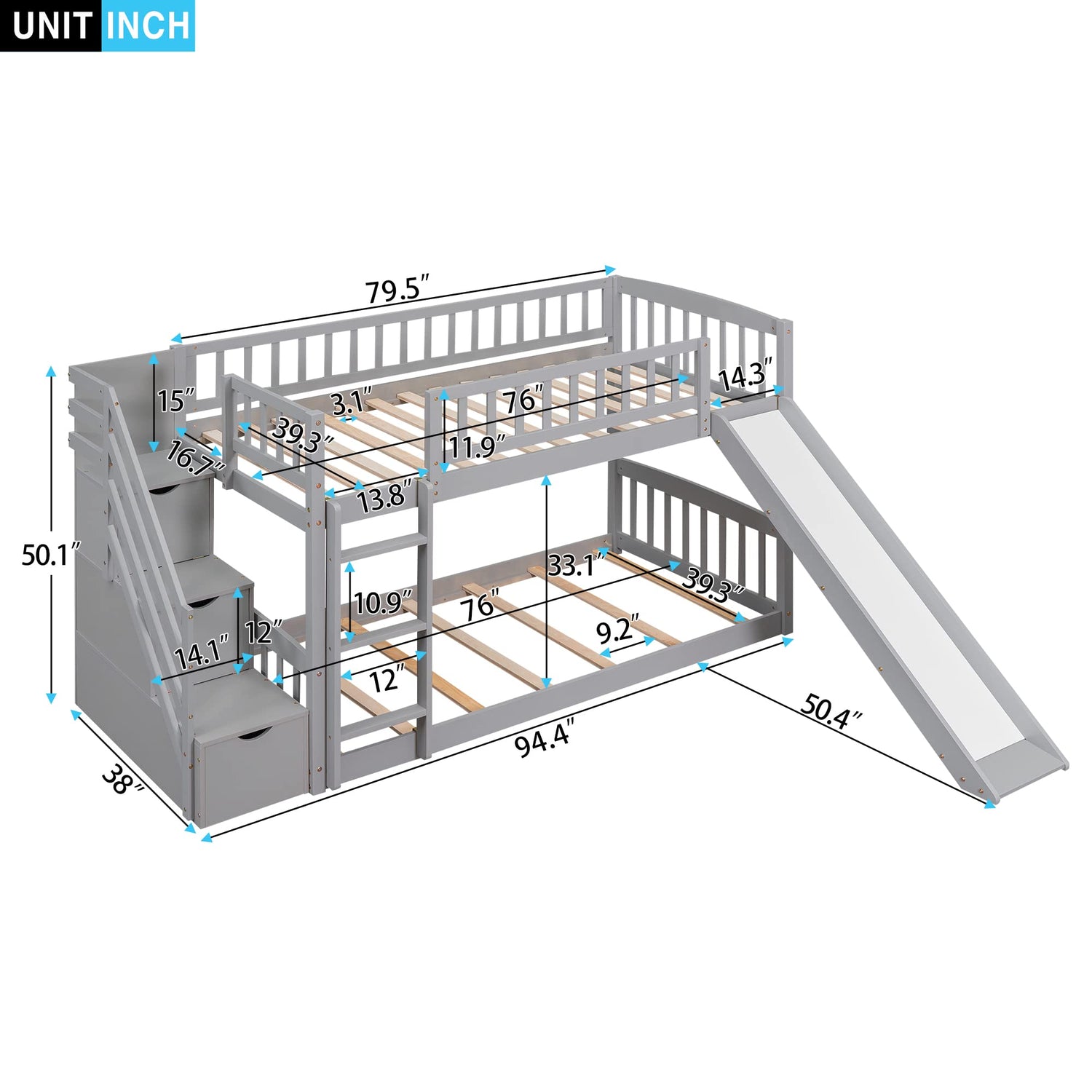• 【Convertible Ladder, Slide & Staircase】:Equipped with a built-in bunk bed ladder, staircase, and low slide, this bunkbed offers easy access to the top bunk while adding fun. Both the ladder and slide are convertible