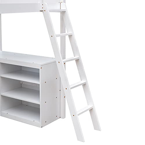 Ball & Cast Twin Size Loft Bed with Full-Length Guard Rail and Storage Shelves,Wood Bedframe w/Ladder & U Shape Desk,Slat Support,Space Saving,Bedroom Furniture for Student Dorms,Studio,White