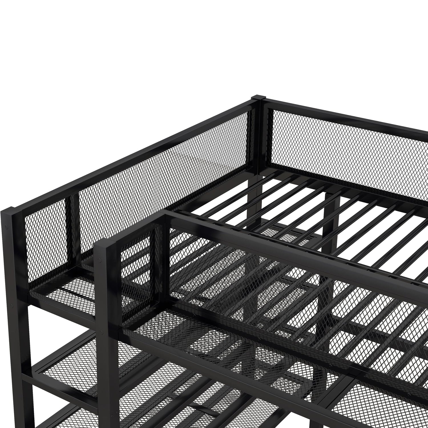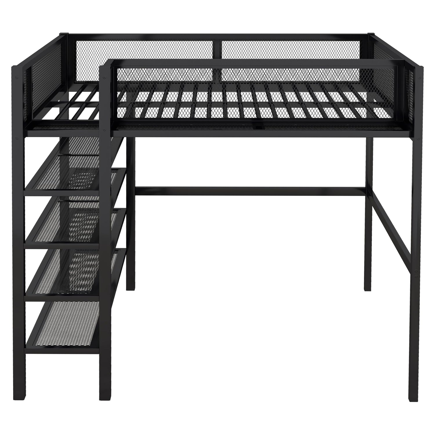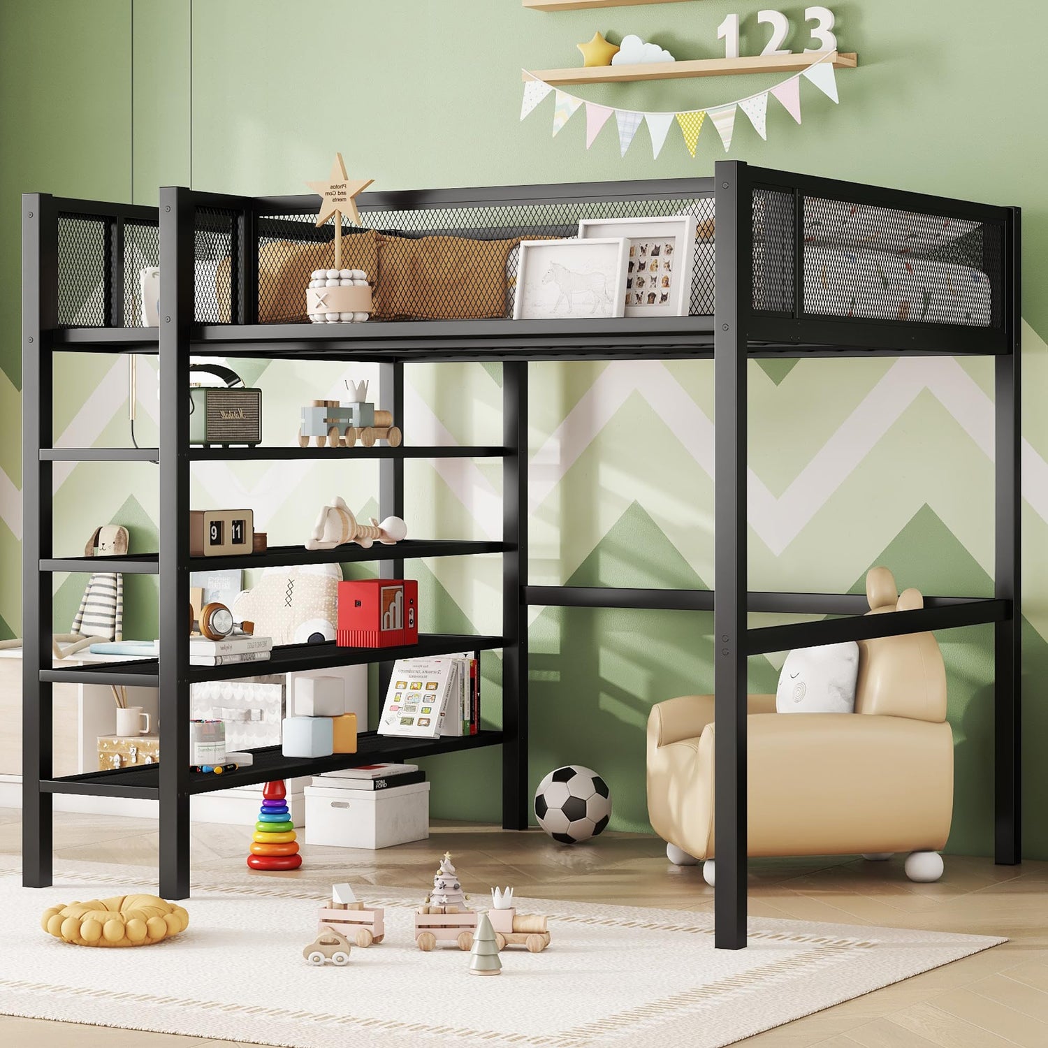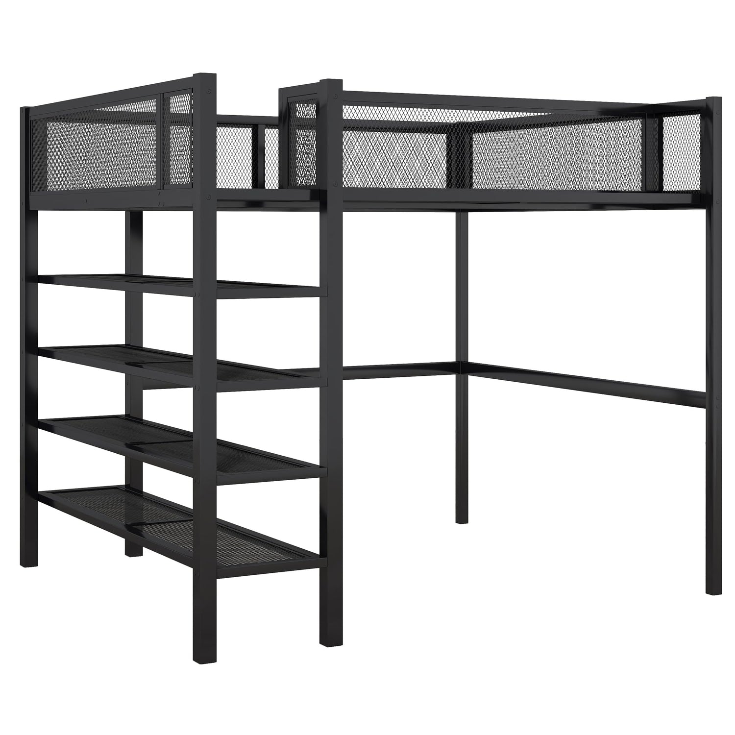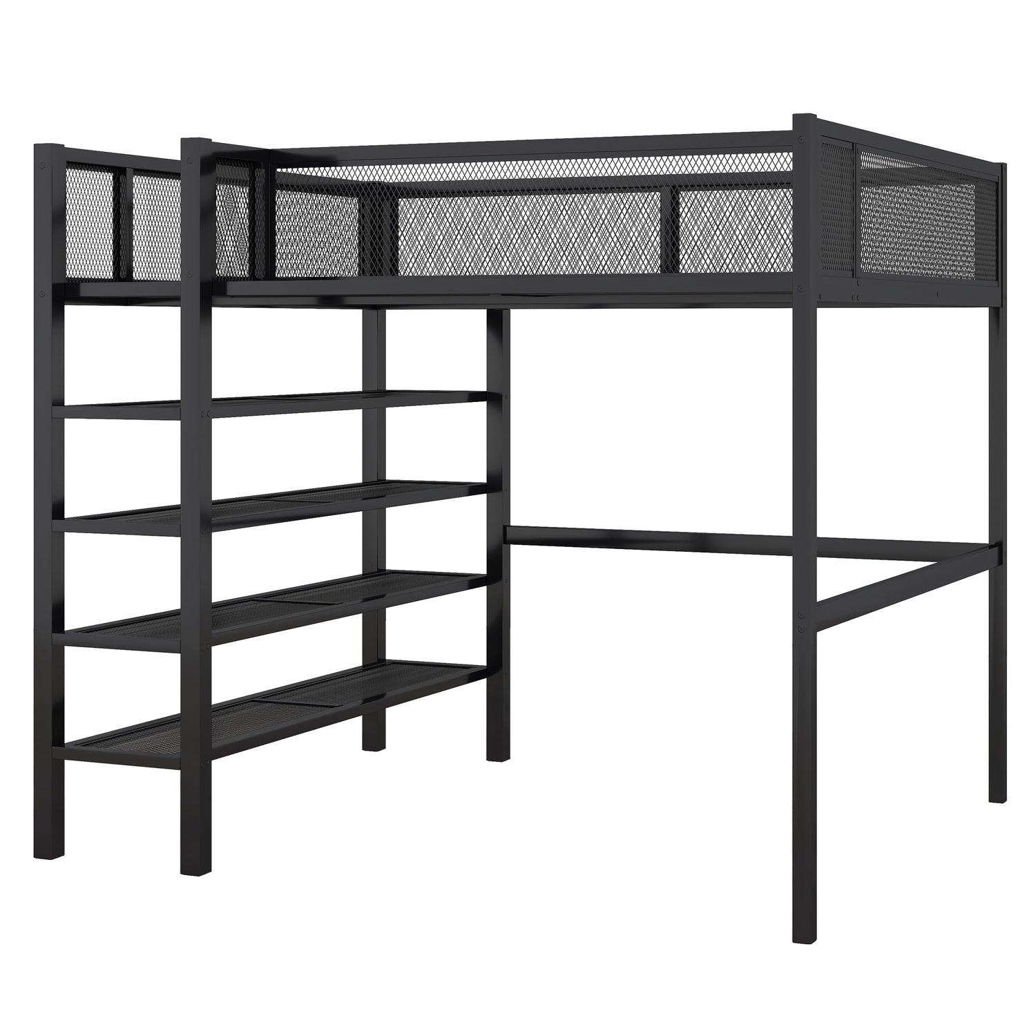 - [Metal Loft Bed with 4-Tier Shelves] Crafted of metal in a clean painted finish, this bed strikes a clean-lined silhouette with a horizontal slatted headboard and footboard, matching guard rail, which can be matched with any room decor. The raised base creates a cozy loft space for storage or play.