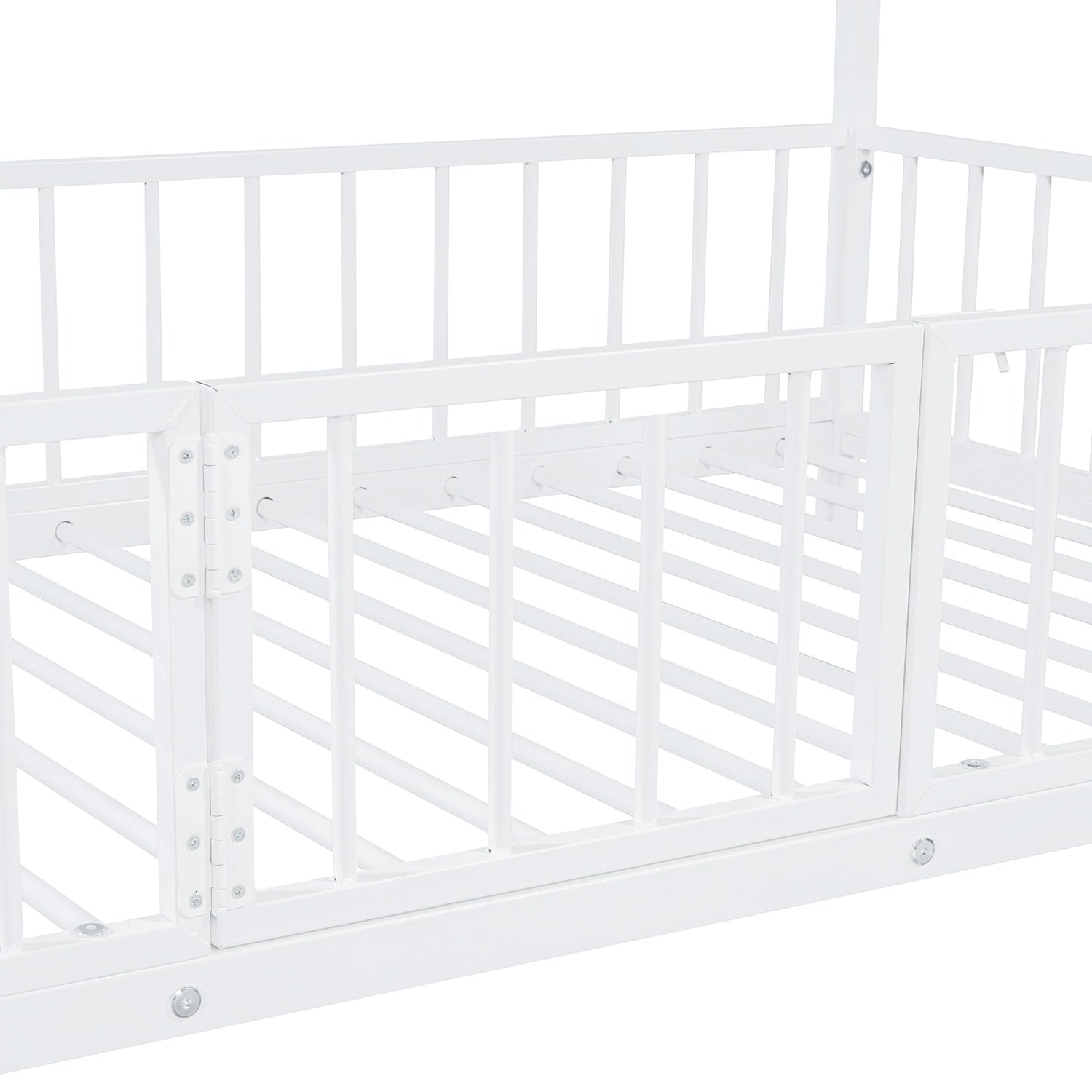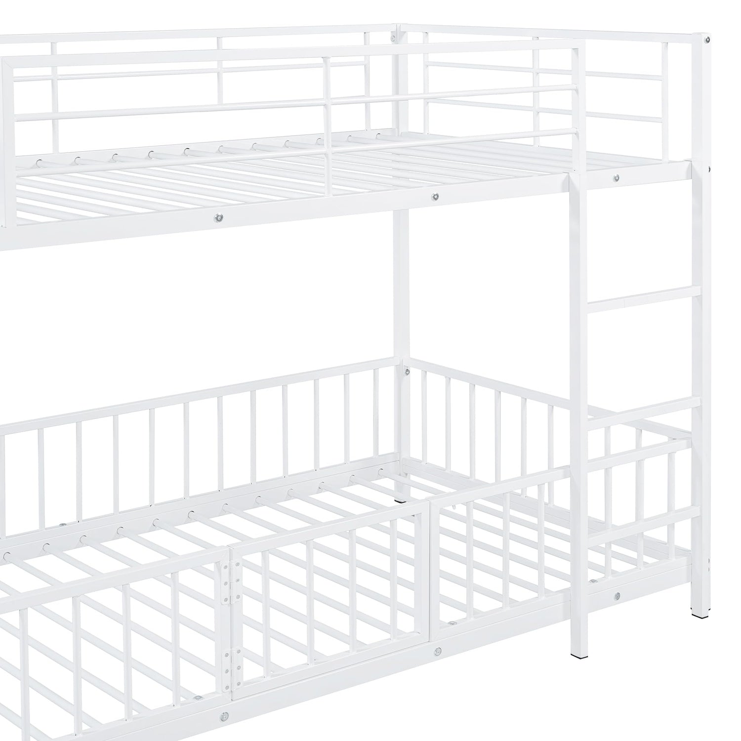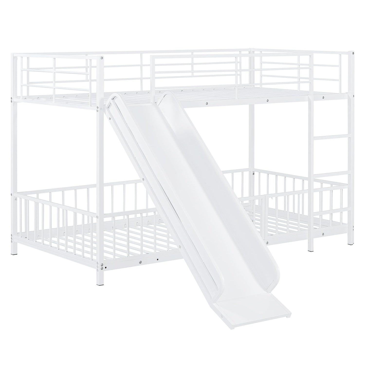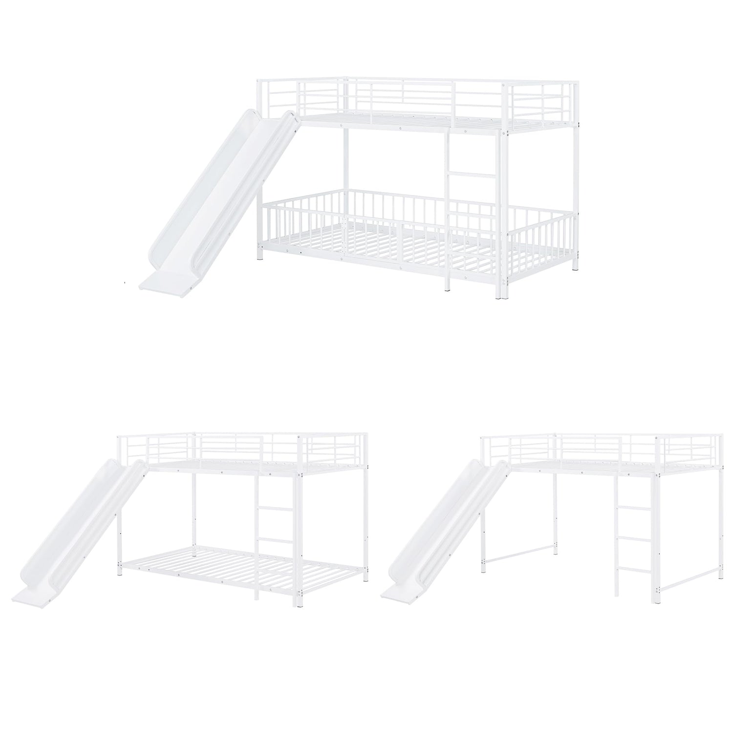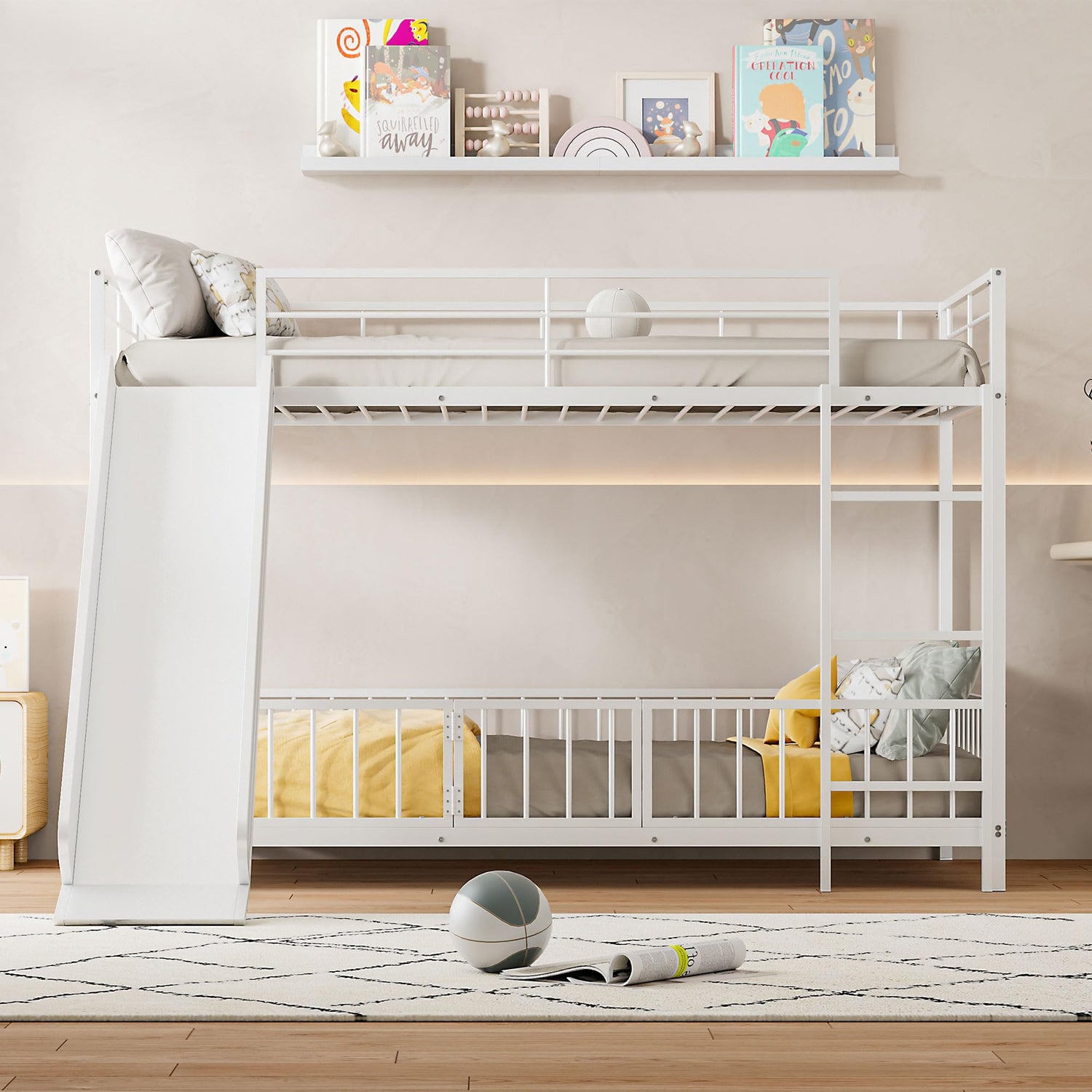 Bellemave Twin Over Twin Bunk Bed with Slide and Ladder, Metal Bunk Bed for Kids, Girls, Boys, Removable Fence, Low Bunk Bed with Slide, with Door, White