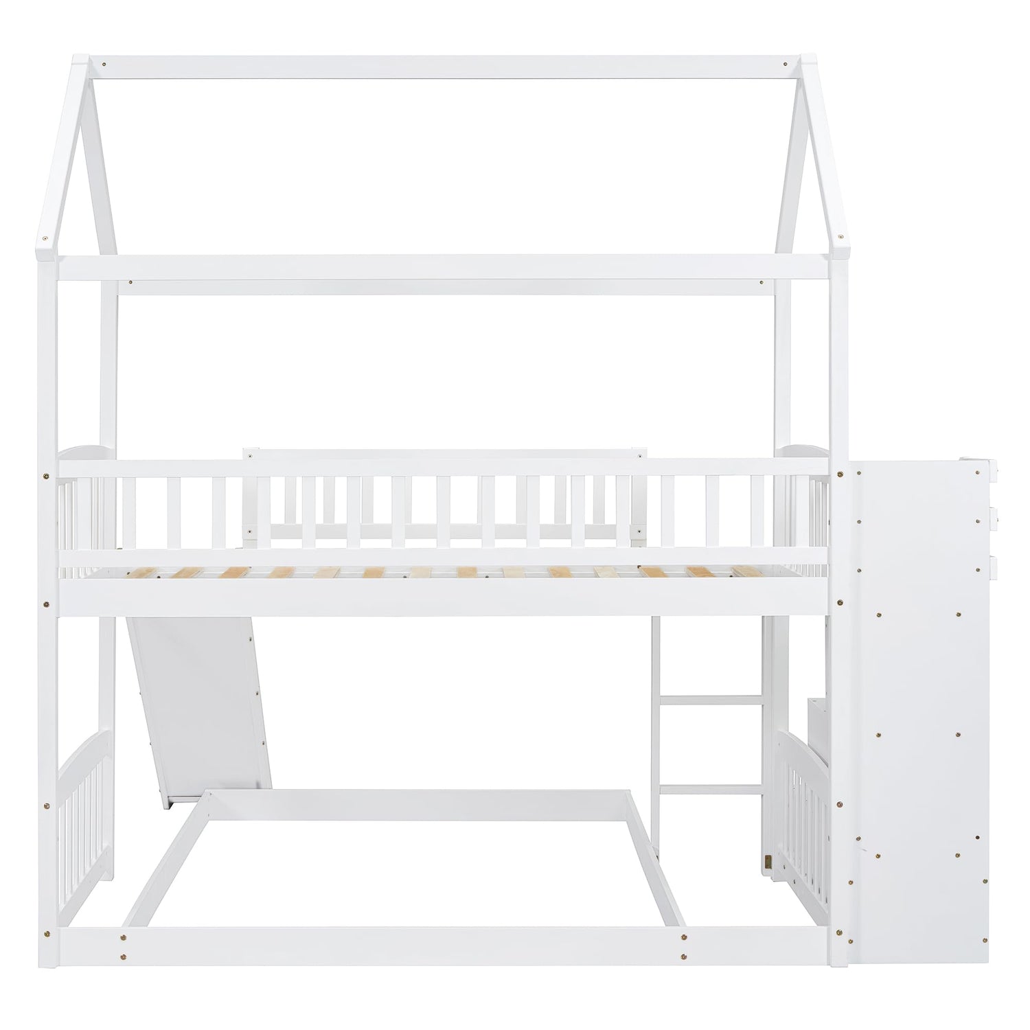 Bunk Bed with Slide, House Bunk Beds Twin Over Full Stairway Bunk Beds Playhouse Bunkbed with Storage for Kids Toddlers Girls/Boys, White