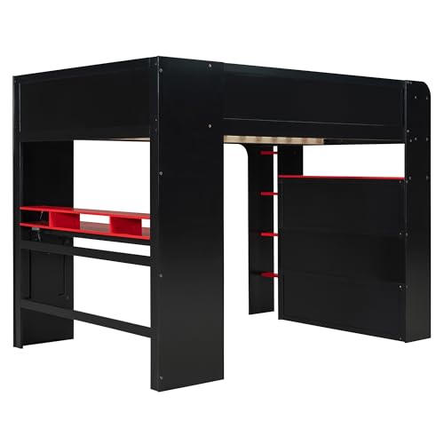 CKLMMC Full Size Gamer Loft Bed with Height-Adjustable Desk,Wardrobe,Ample Storage Space,and RGB Light, Wooden Bunk Bed for Gaming Setup (Red/A1)