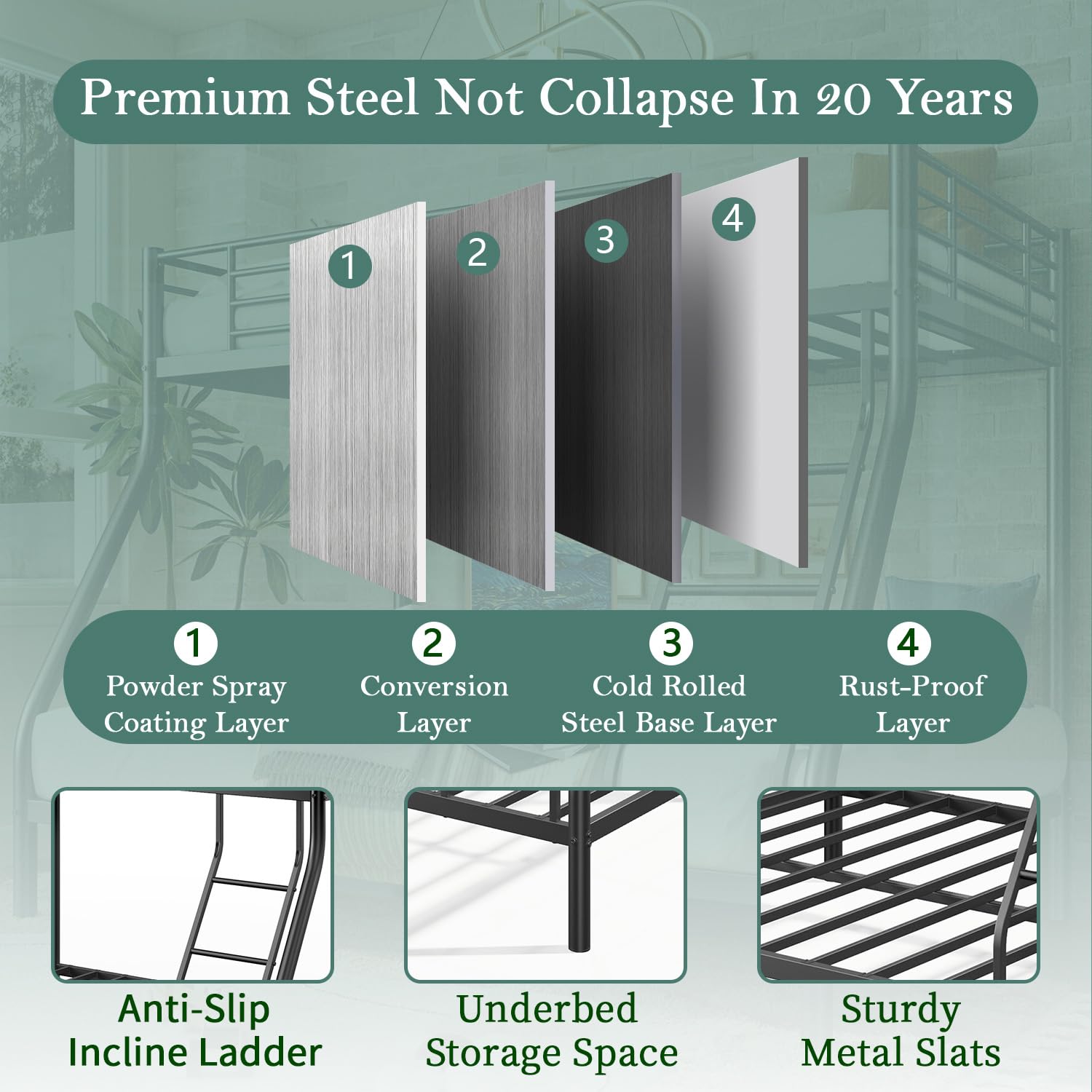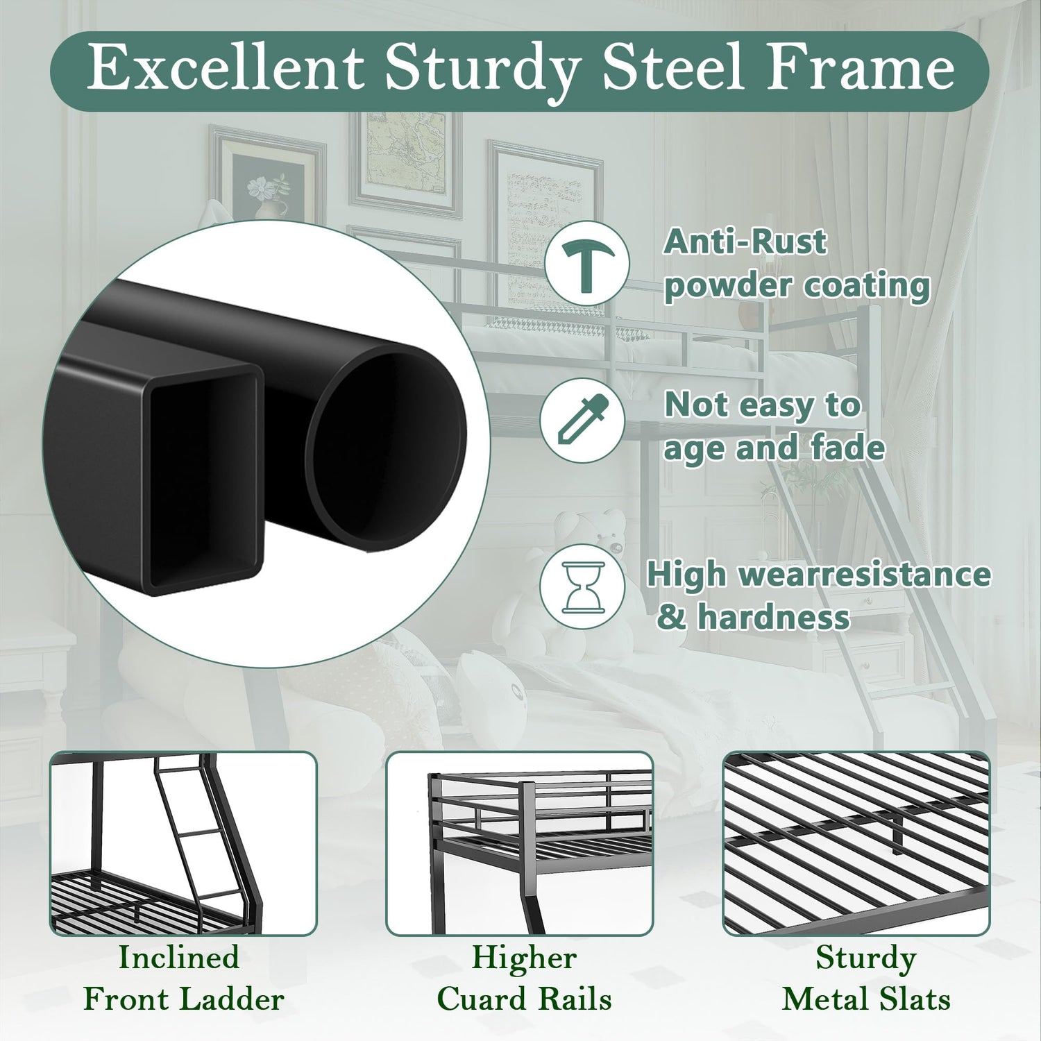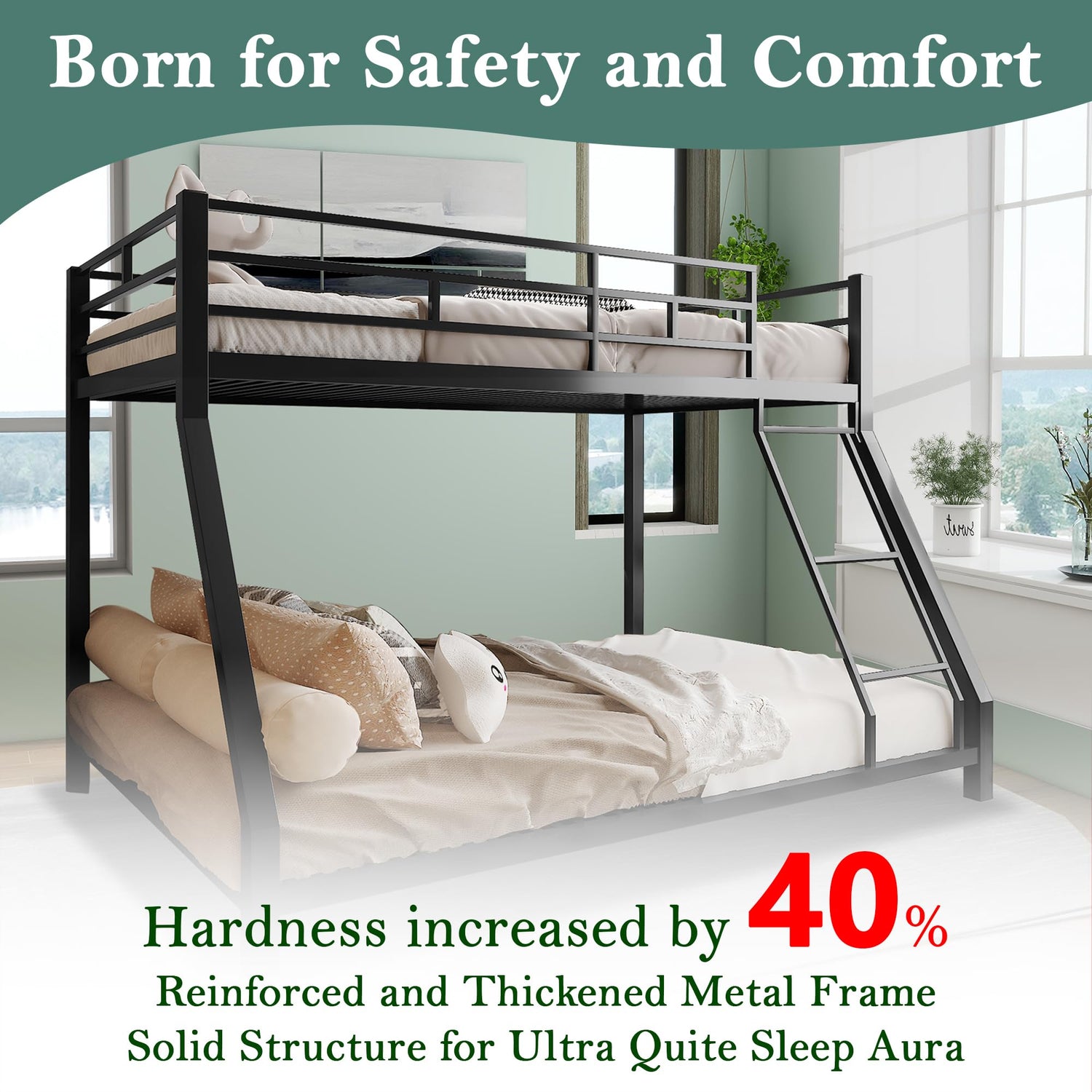 Cyranture Bunk Bed Twin Over Full Size, Twin Over Full Bunk Beds with Ladder & Guardrail Heavy Duty Bunk Beds Frame for Teens Adults Dorm Bedroom Guest Room, No Box Spring Needed(Black)