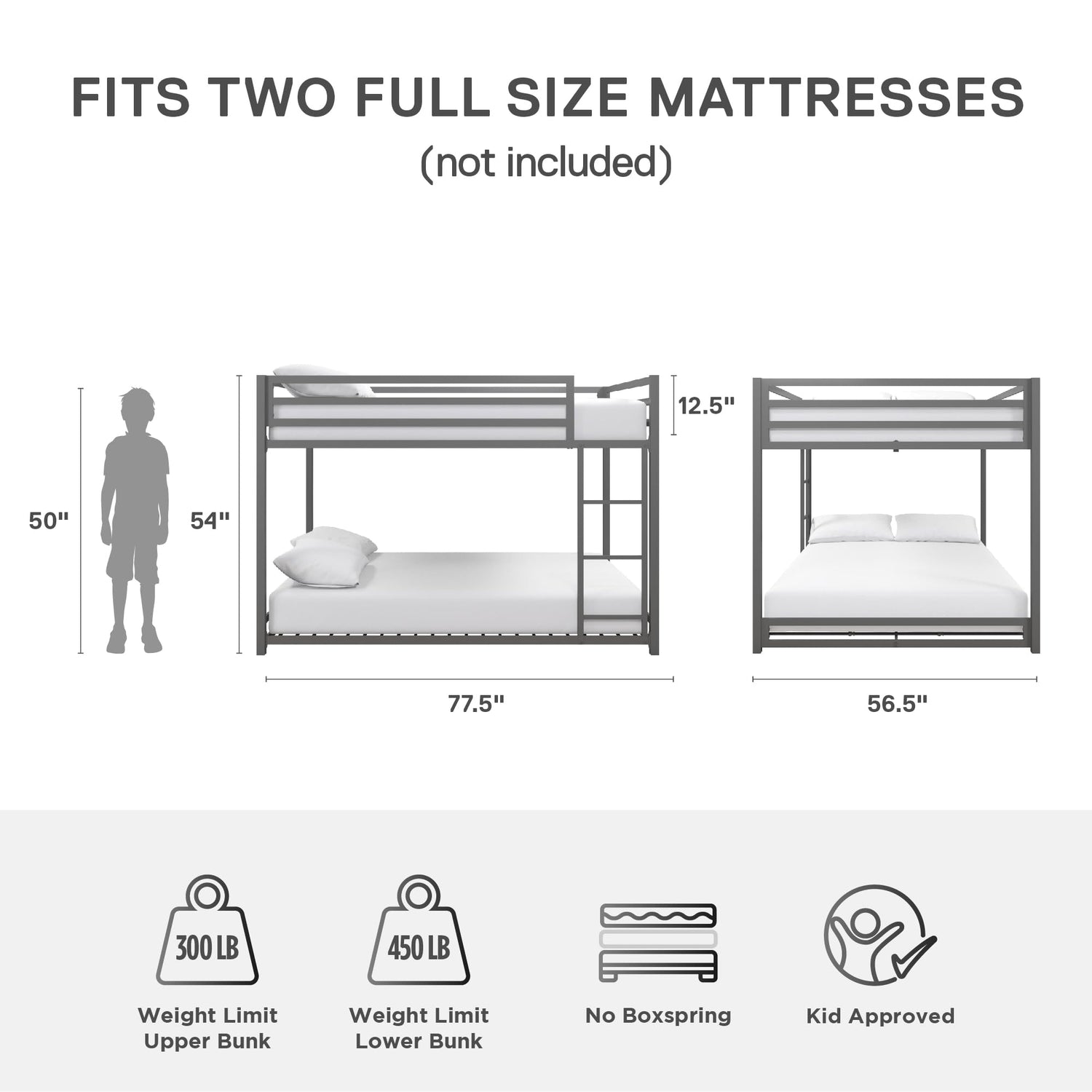 - Built for safety: The bunk bed frame incudes an integrated 3-step ladder and 12.5" guard rail for top bunk safety. Assembled dimensions: 77.5"L x 56.5"W x 54"H. Max weight limit: top bunk: 300 lbs, bottom bunk: 450 lbs.