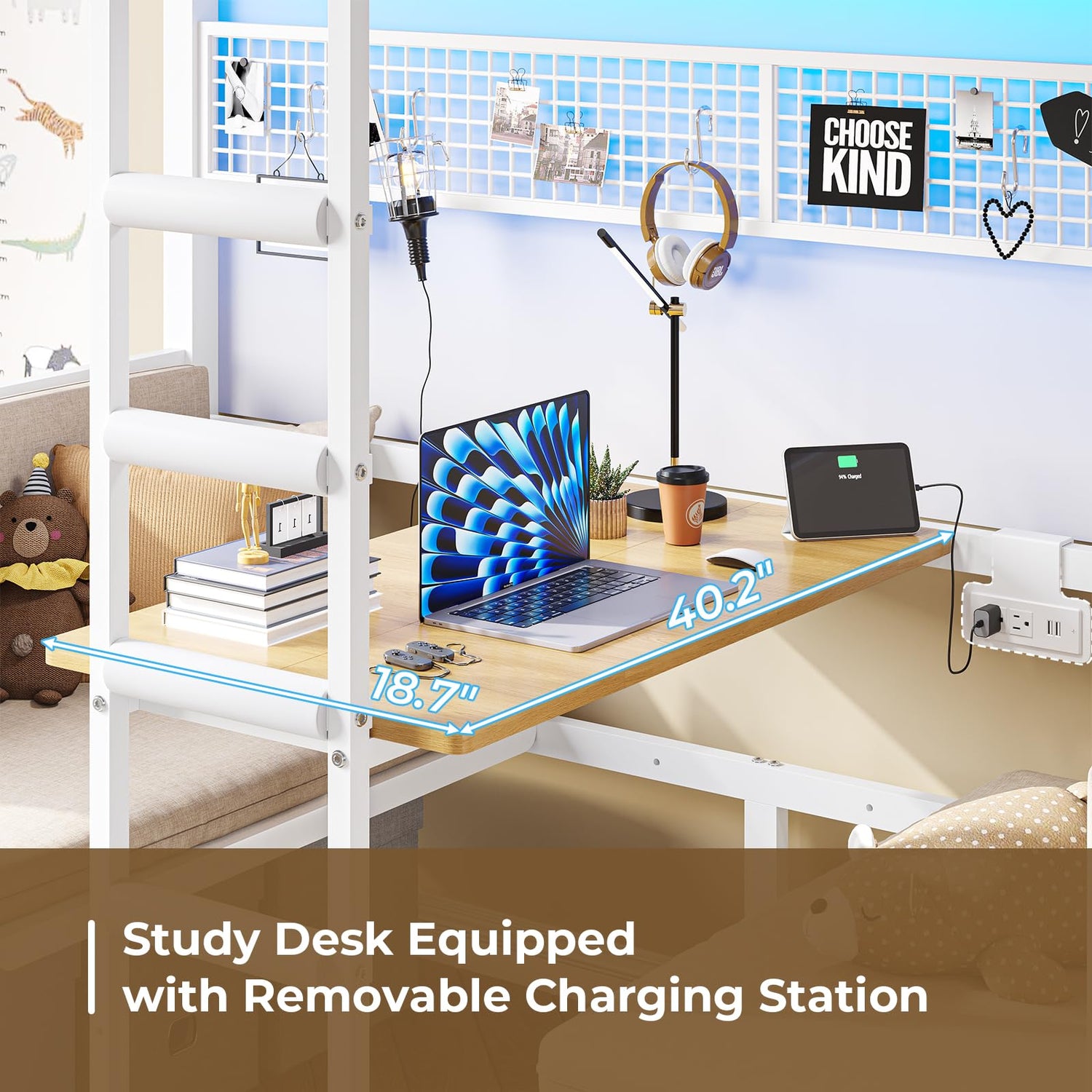DICTAC Loft Bed Twin Size with Desk and Seat Convertible Twin Over Twin Bunk Bed with Led Lights & Charging Station Metal Bunk Bed with Safety Guard&Stair for Teens,Adults,White(Cushion not Included)