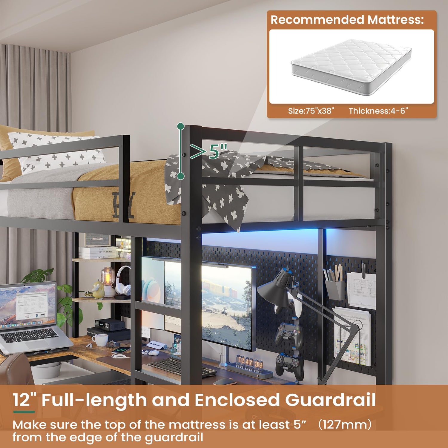 DICTAC Twin Loft Bed with U-Shaped Desk, LED Lights, Charging Station, and Storage Shelves – Metal Frame in Black