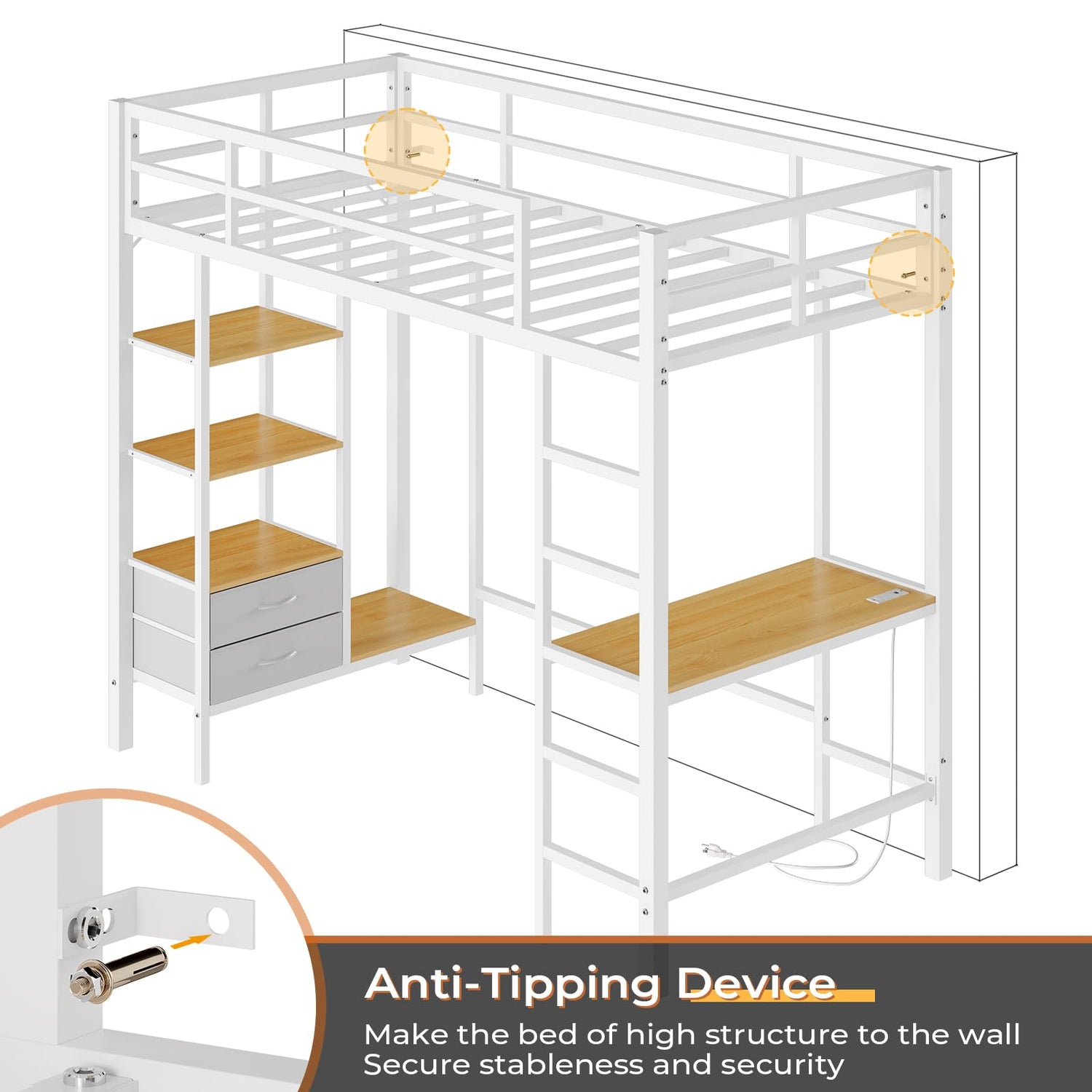 Safety is a top priority with this loft bed. The top bunk comes with full-length and heightened guardrails, stabilising the structural integrity of the bed while ensuring your safety while sleeping. It is crucial to position the mattress so that its top rests at least 5” from the edge of the guardrail, with a recommended height of 4-6 inches. To further enhance security, strong metal Anti-Tipping Nails are provided for fastening the bed securely to the wall.