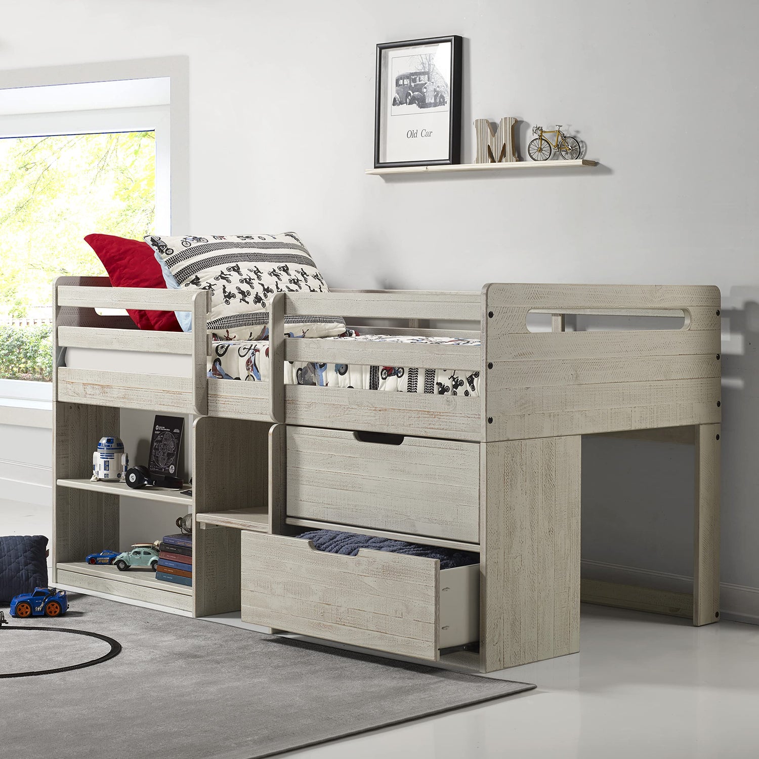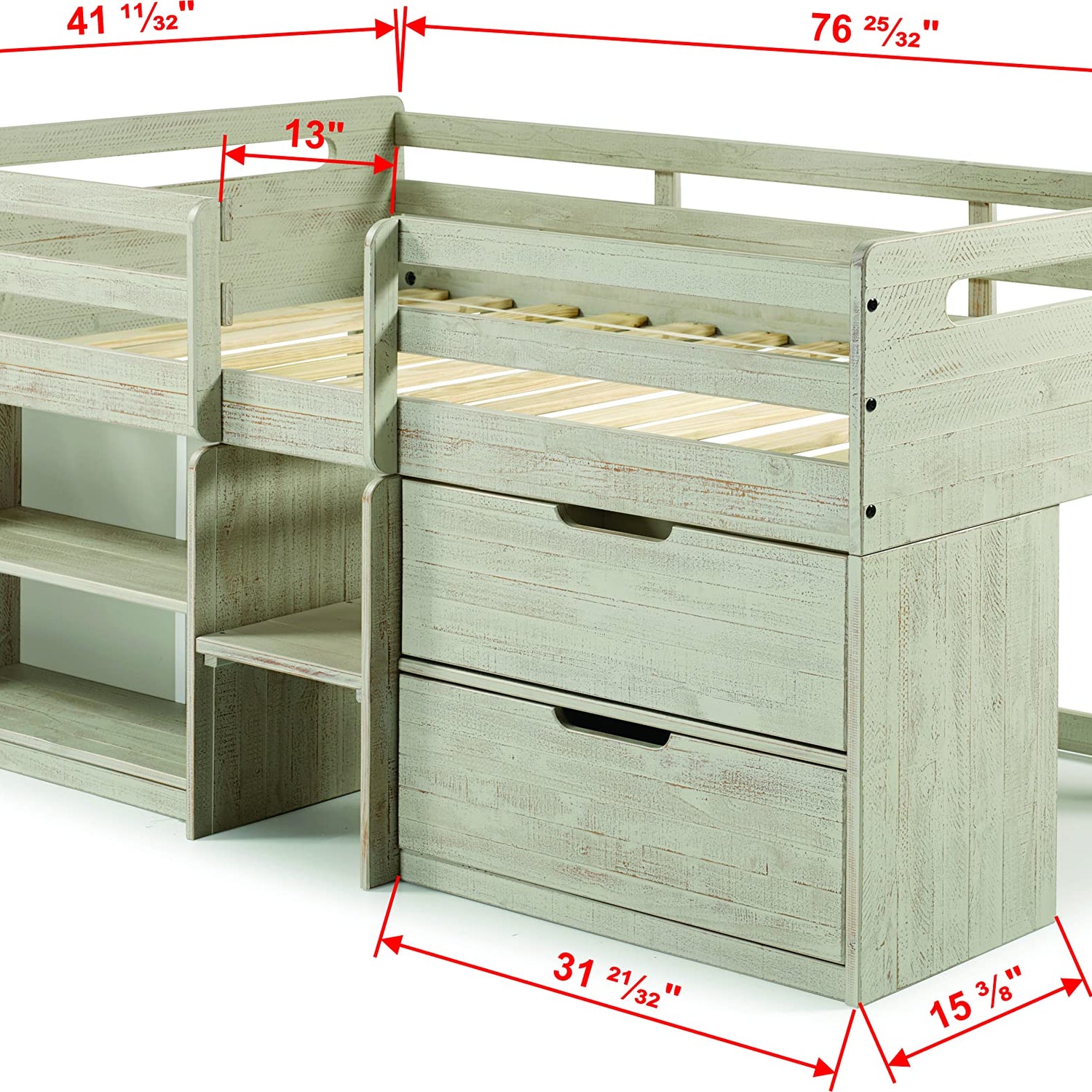 Donco Kids Twin Low Loft Bed with Bookcase and Storage Chest, Twin, Rustic Light Grey