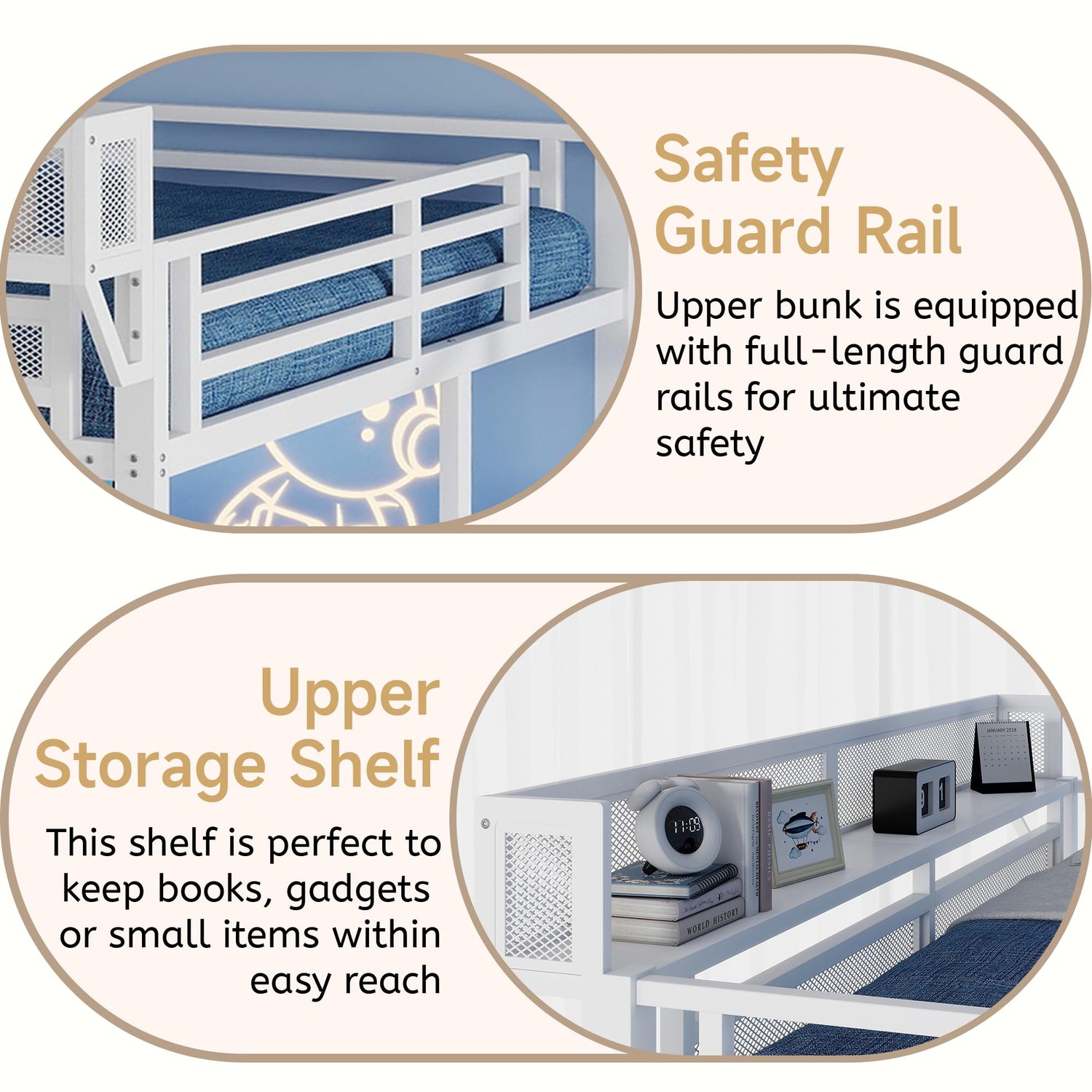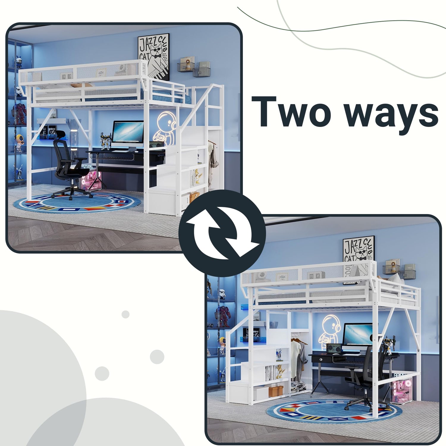 • 【Metal Loft Bed with Wardrobe】: The staircase has a built-in wardrobe function, providing additional storage space for clothes and accessories. This clever design adds more functionality to the metal loft bed, making it the perfect solution for small bedrooms.